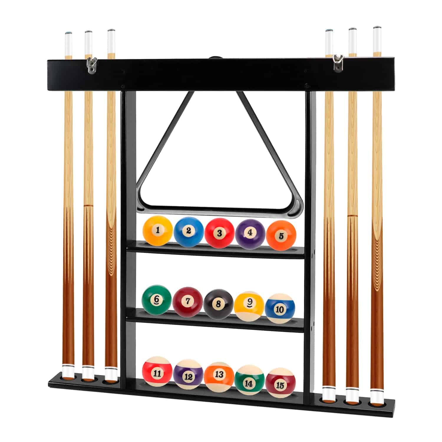 2. Capacidad de almacenamiento optimizada: El rack de tacos de pared puede contener hasta 6 tacos de billar y un juego completo de 16 bolas de billar. Diseñado para mantener organizada su sala de billar y sus equipos en condiciones óptimas, este rack es un accesorio imprescindible para cualquier entusiasta del billar.