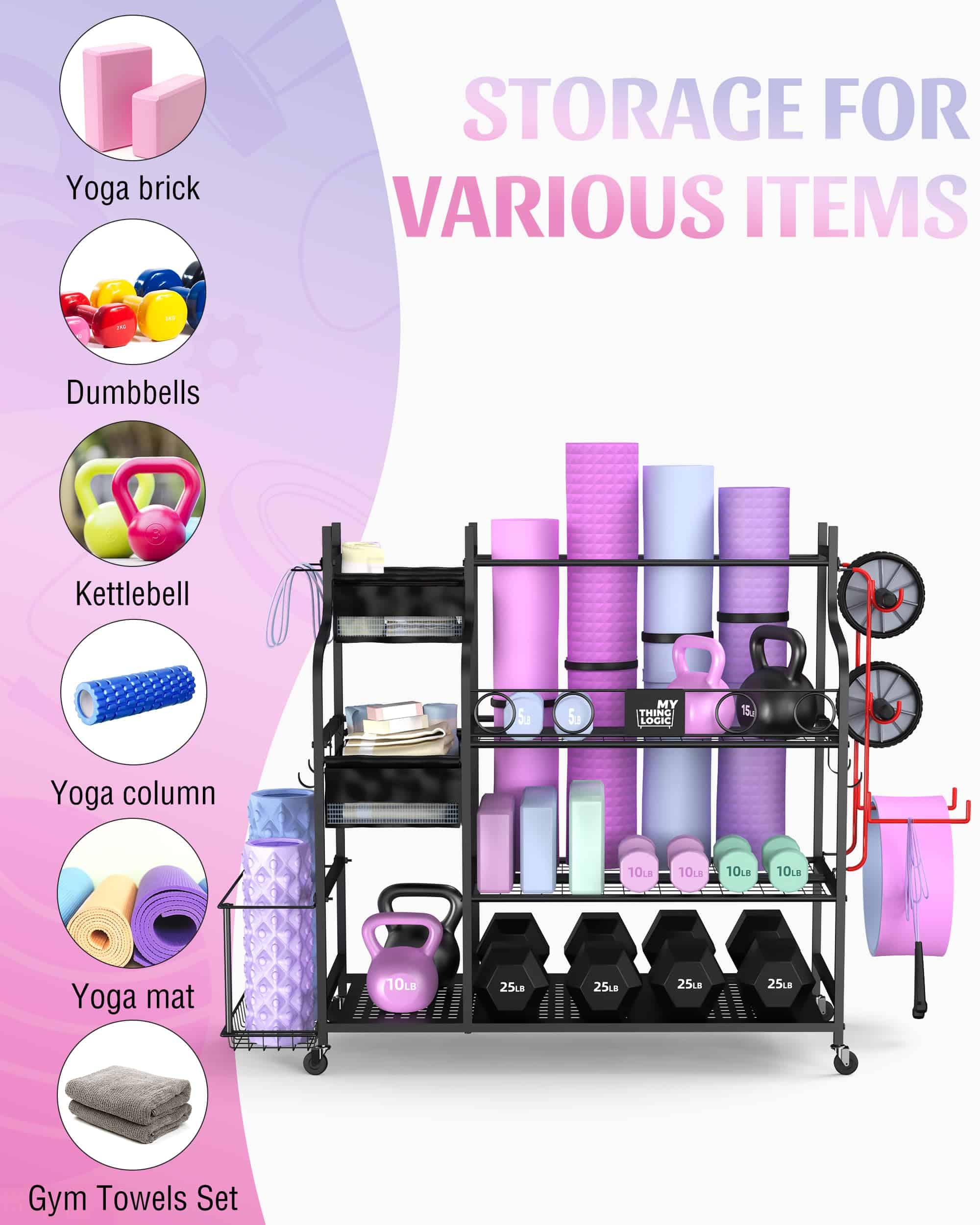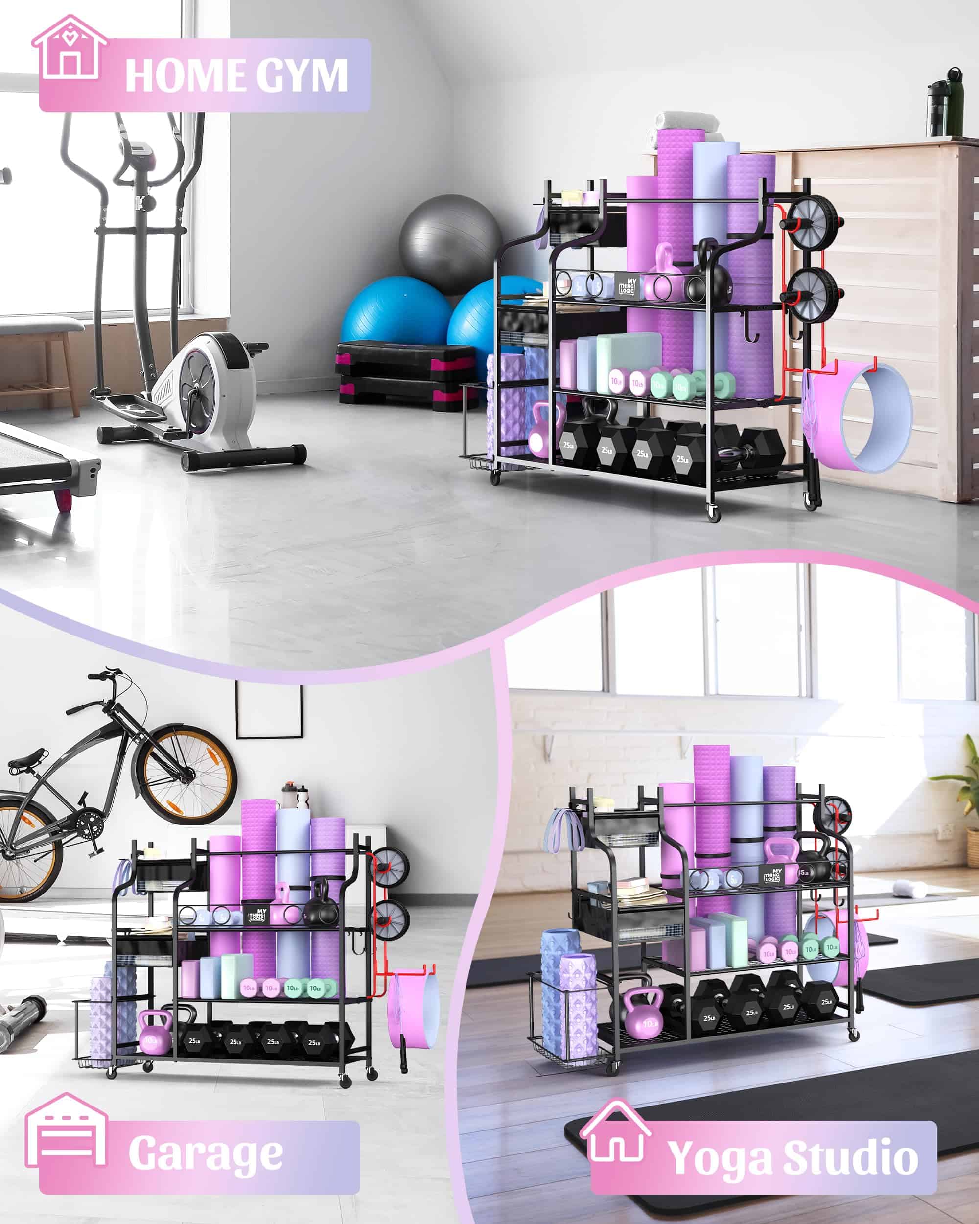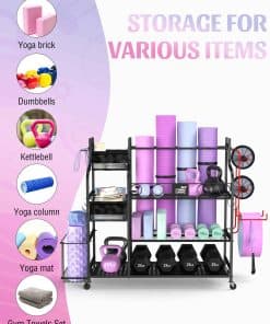 1. ALMACENAMIENTO DE VARIOS EQUIPOS DE ENTRENAMIENTO: Este rack de almacenamiento para gimnasio en casa puede ayudar a almacenar su tapete de yoga, mancuernas, pesas rusas, ladrillo de yoga, bandas de resistencia, rueda abdominal, rodillo de espuma, toalla de gimnasio. Todo en uno para sus artículos de entrenamiento.