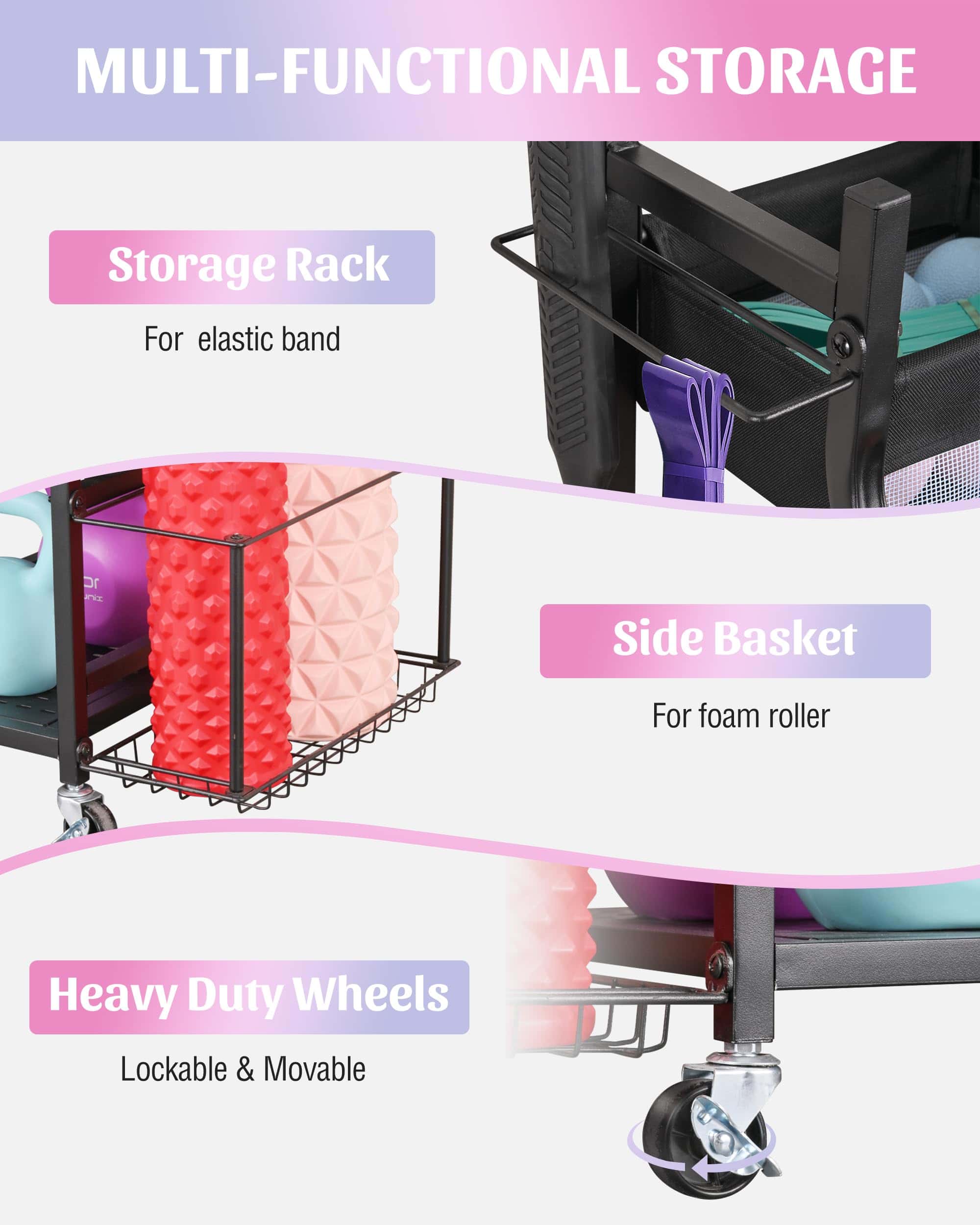 4. RUEDAS DE SERVICIO PESADO: Este carrito de almacenamiento de yoga viene con 4 ruedas fuertes de 360 grados (2 con bloqueo) y se puede rodar fácilmente en interiores y exteriores.