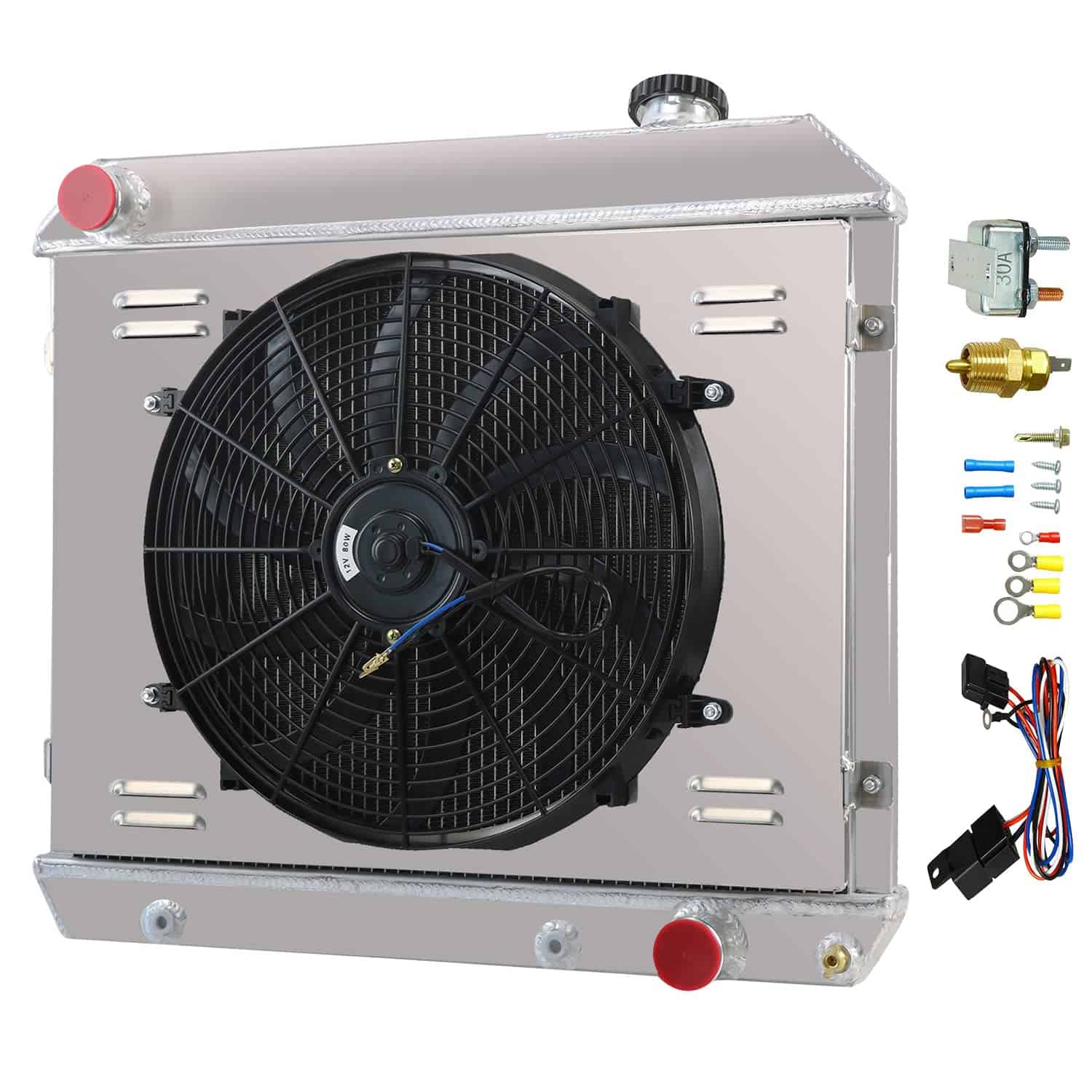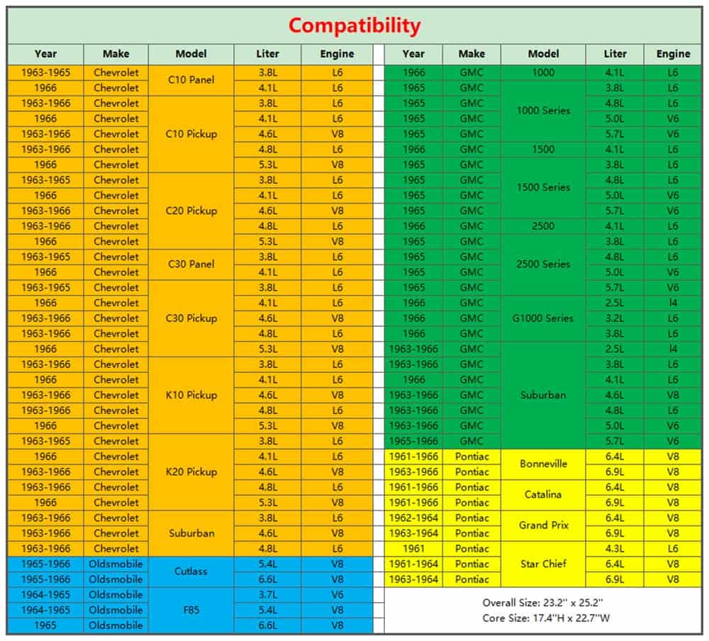 Este listado incluye: 1 x Radiador de aluminio de 3 filas (incluye tapa de radiador), 1 x Carcasa de aluminio, 1 x Ventilador de 16″ (incluye kits de montaje), 1 x Kit de relé de termostato. Cuello de llenado y tapón mecanizados por CNC incluidos, grifo de drenaje de latón estilo OEM incluido. Instrucciones del Kit de relé de termostato: El cable ROJO + se conecta directamente a la batería. El cable BLANCO va a la fuente de alimentación del interruptor de encendido. El cable NEGRO va al interruptor de termostato. El cable AZUL va a los ventiladores. Especificaciones del Ventilador: CFM máximo del ventilador: 2000 200, diámetro del ventilador (in): 16.050 pulgadas, grosor (in): 2.790 pulgadas, número de aspas: 10 aspas, RPM máximo del ventilador: 2,250 rpm, material de la hoja: plástico, consumo de amperios: 12.70 amperios. Incluye las pestañas de montaje para una instalación fácil con sujetadores. Números de parte alternativos/OEM: … Este radiador es compatible con: Chevrolet C10 Panel, 1963-1966, Chevrolet C10 Pickup, 1963-1966, Chevrolet C20 Pickup, 1963-1966, Chevrolet C30 Panel, 1963-1966, Chevrolet C30 Pickup, 1963-1966, Chevrolet K10 Pickup, 1963-1966, Chevrolet K20 Pickup, 1963-1966, Chevrolet Suburban, 1963-1966, GMC 1000, 1966, GMC 1000 Series, 1965, GMC 1500, 1966, GMC 1500 Series, 1965, GMC 2500, 1966, GMC 2500 Series, 1965, GMC G1000 Series, 1966, GMC Suburban, 1963-1966, Oldsmobile Cutlass, 1965-1966, Oldsmobile F85, 1964-1965, Pontiac Bonneville, 1961-1966, Pontiac Catalina, 1961-1966, Pontiac Grand Prix, 1962-1964, Pontiac Star Chief, 1961-1964.