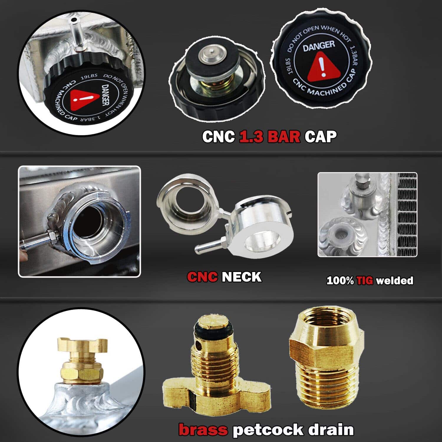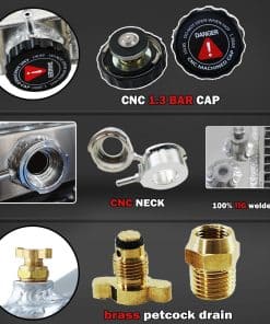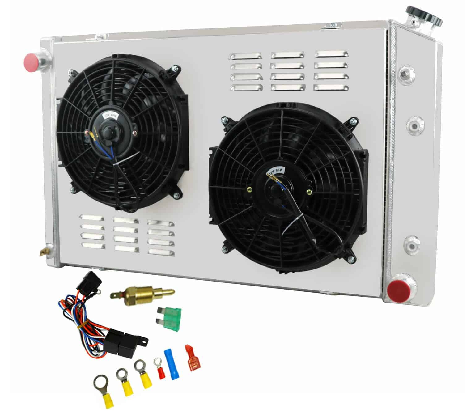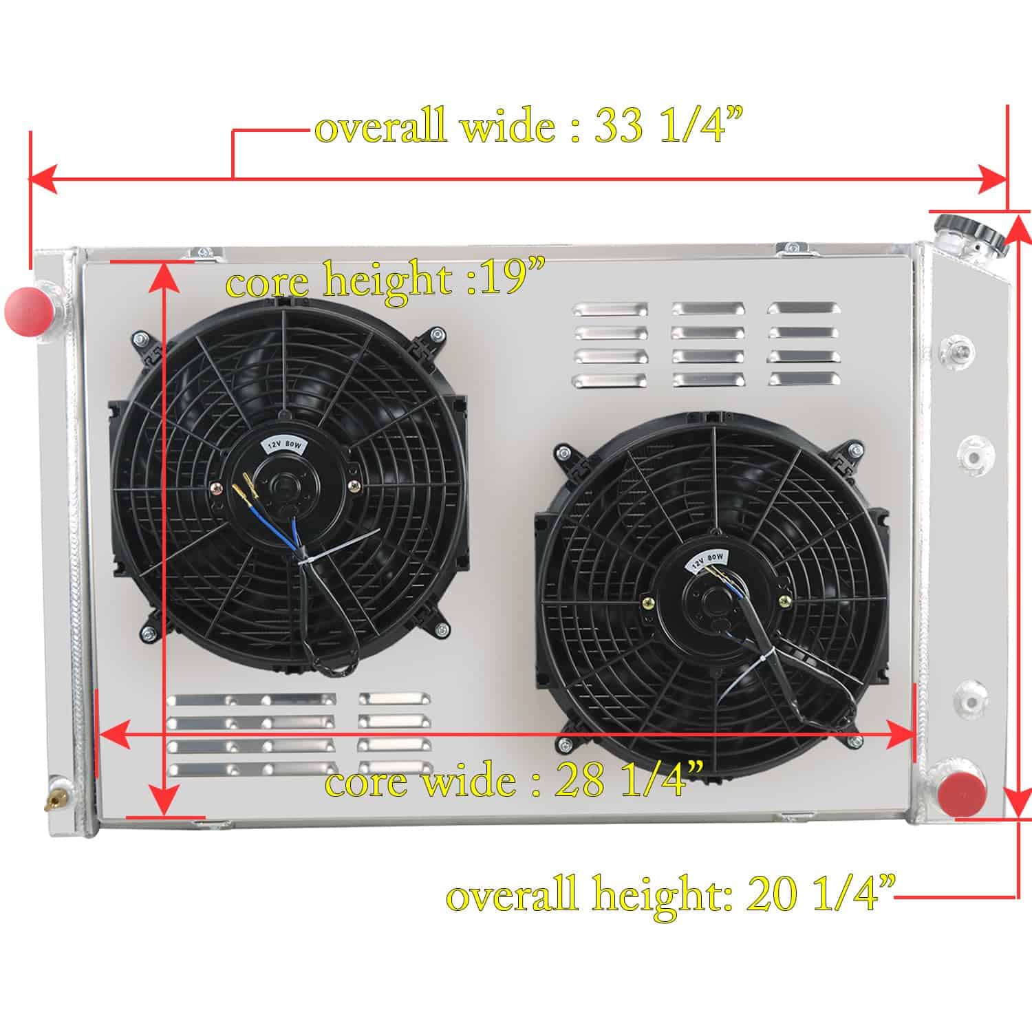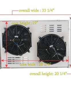 Paquete Incluye: 1 X Radiador de Aluminio AA5052 de 3 Filas 1 X Tapa de Radiador Mecanizada CNC 1 X Revestimiento de Aluminio AA5052 2 X Ventiladores de 12″ (Incluye kits de montaje) 1 X Kit de Relé de Termostato. Tamaño del Radiador: Especificaciones de Carreras de Alto Rendimiento. Diseño de Carreras de 3 Filas de Tubos. Válvula de drenaje de latón estilo OEM. Tamaño del Núcleo: 19″ alto x 28-1/4″ ancho. Tamaño total: 20-1/4″ alto x 33-1/4″ ancho. Entradas superiores: 1 1/2″ en el lado del conductor. Salidas inferiores: 1 1/2″ en el lado del pasajero. Transmisión: Automática y Manual. VENTILADORES: Voltaje: 12v. CFM máximo del Ventilador: 1730 cfm. Diámetro del Ventilador (in): 12.050. Espesor (in): 2.500. Número de Aspas: 10 aspas de tipo S. RPM máximo del Ventilador: 2,250 rpm. Material de la Aspa: Plástico. Consumo de Amperios: 12.70 amperios. Incluye las Pestañas de Montaje para una Fácil Instalación con Bridas. Instalación del Kit de Termostato: Ajuste universal para cualquier vehículo automotriz y ventilador eléctrico. Se activa conectando a tierra los ventiladores eléctricos a una temperatura preestablecida. Temperatura de Encendido a 180°F, Temperatura de Apagado a 165°F. La sonda se enrosca típicamente en el radiador, salida de agua o colector. Conexión ROJA directamente a la batería. Cable BLANCO a la fuente de energía del interruptor de encendido. El cable NEGRO va al interruptor de termostato. El cable AZUL va a los Ventiladores. Las ventajas de nuestro radiador: Hecho de aluminio de grado de aeronave AA5052 para una vida útil prolongada con acabado de aluminio crudo. Tecnología core technology para garantizar un rendimiento óptimo y confiabilidad. Todos los tanques y accesorios de aluminio AA5052 de 2 mm de espesor, garantizan que sea resistente y duradero. Cuello de llenado de aluminio billet CNC mecanizado resistente y duradero. Tapa mecanizada CNC con artesanía grabada, tratamiento anodizado. Válvula de drenaje de latón estilo OEM mucho mejor que otros de plástico. Cuidadosamente elaborado para cumplir con los estándares OE excepcionales para un ajuste preciso. Compatibilidad del Vehículo: Para 1990 Chevy Blazer / GMC V3500. Para Chevy C10 4.1L 4.8L 5.0L 5.7L 6.2L 6.6L 7.4L 1975 1979 1981 1983. Para Chevy C10 Suburban 1974 1975 1979 1985. Para Chevy C20 4.1L 4.3L 4.8L 5.0L 5.7L 6.2L 7.4L 1976 1980 1981 1982 1986. Para Chevy C20 Suburban 1974 1975 1979 1983. Para Chevy C30 1977 1982 1986. Para Chevy C30 Pickup 1974. Para Chevy K10 1978 1979 1982 1986. Para Chevy K10 Pickup/GMC P35/P3500 Van 1973. Para Chevy K10 Suburban 1979 1984. Para Chevy K20 1975 1979 1985. Para Chevy K20 Suburban 1974 1978 1982 1986. Para Chevy K30 1978 1984. Para Chevy K30 Pickup 1974. Para Chevy K5 Blazer 4.1L 5.0L 5.7L 6.6L 1979. Para Chevy P10 Van 4.1L 5.0L 5.7L 7.4L 1973. Para Chevy P20 1979 1983 1988. Para Chevy P30 1977 1981 1985 1993. Para Chevy P30 Van 1974.