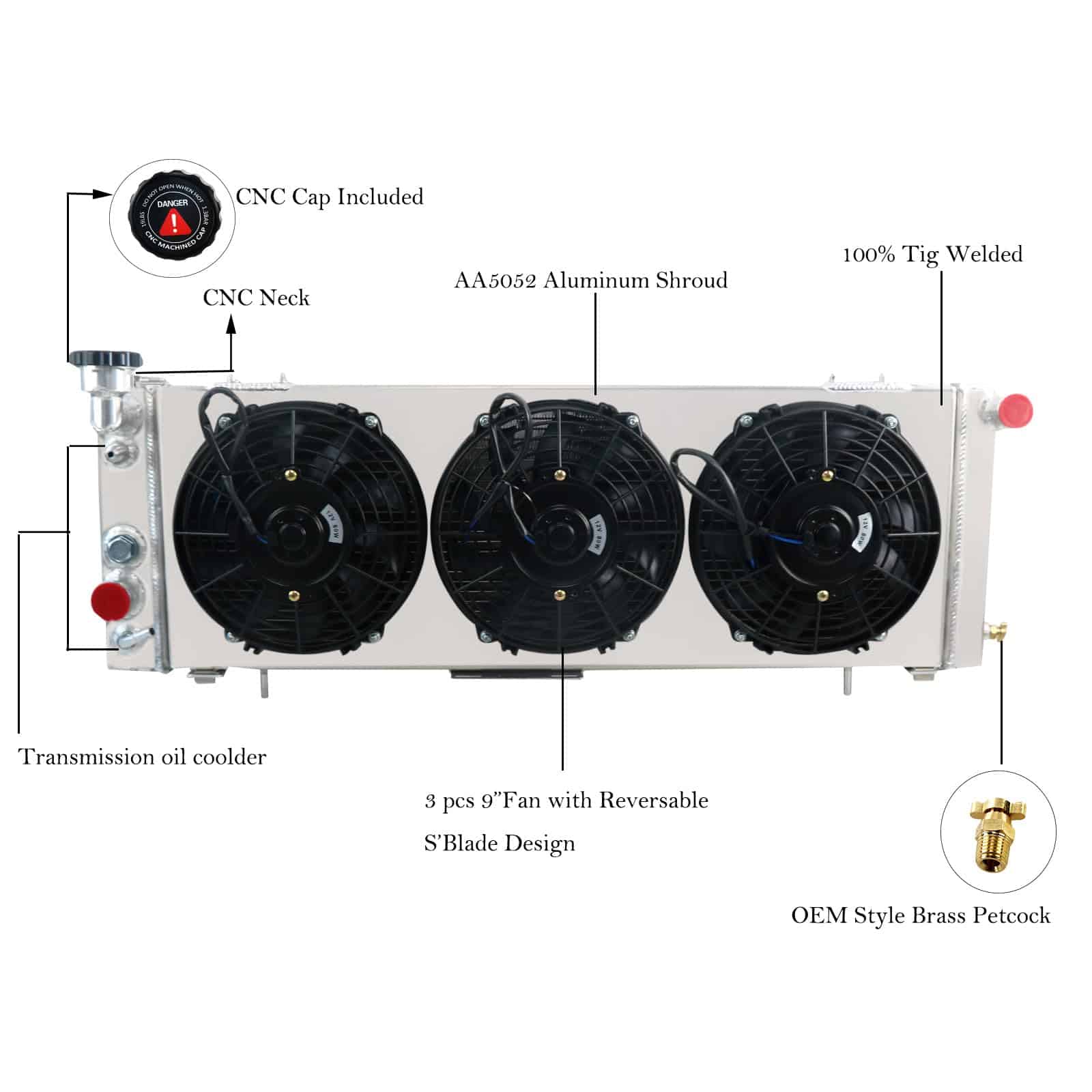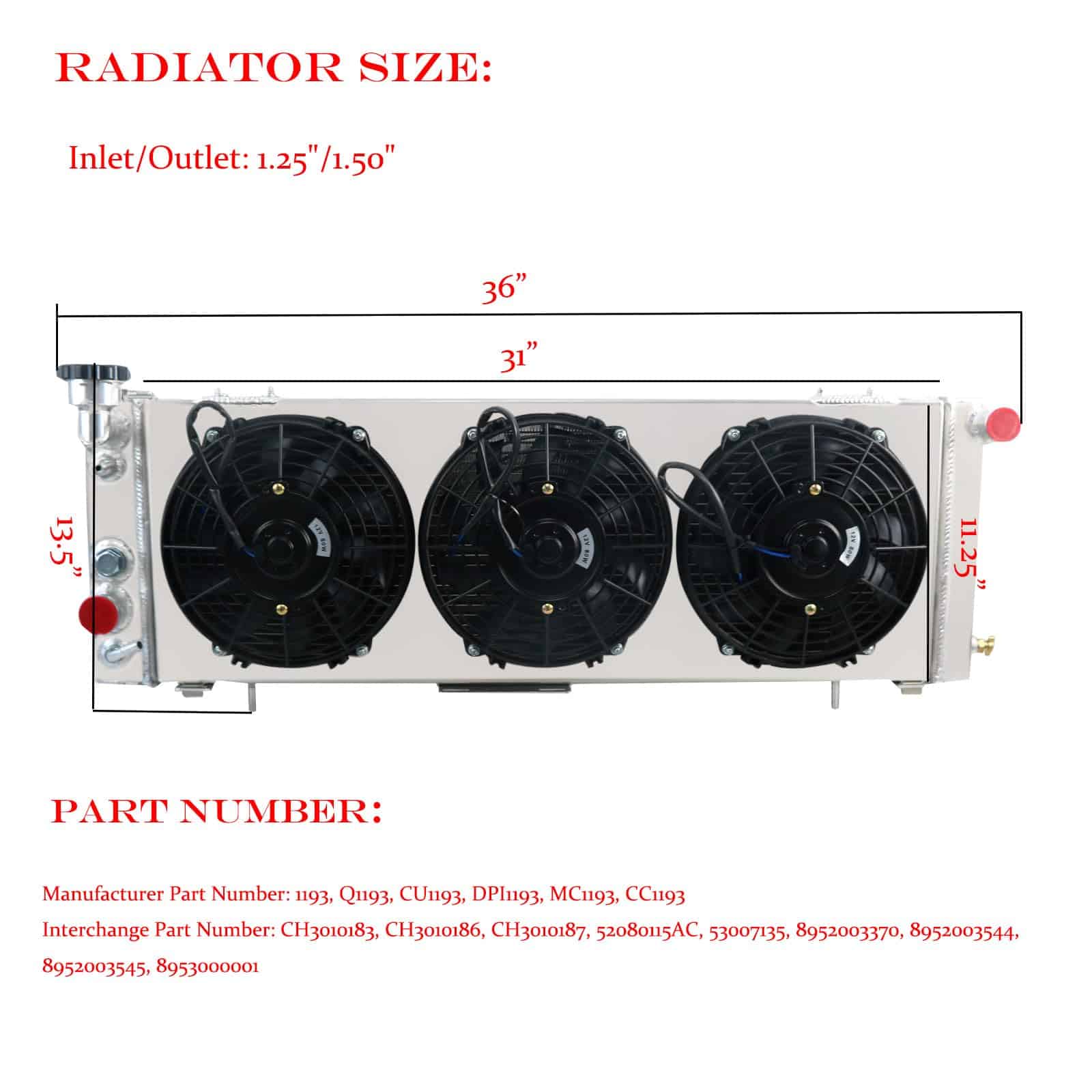 Radiator compatible con una variedad de modelos Jeep Cherokee y Comanche de 1991 a 2001. Núcleo de aluminio 5052 de grado aeronáutico, flujo cruzado con soporte de montaje de pin. Incluye ventiladores de 9″, kit de termostato y diferentes números de parte como 1193, SBR1193, CC1193, CU1193, DPI1193, entre otros.