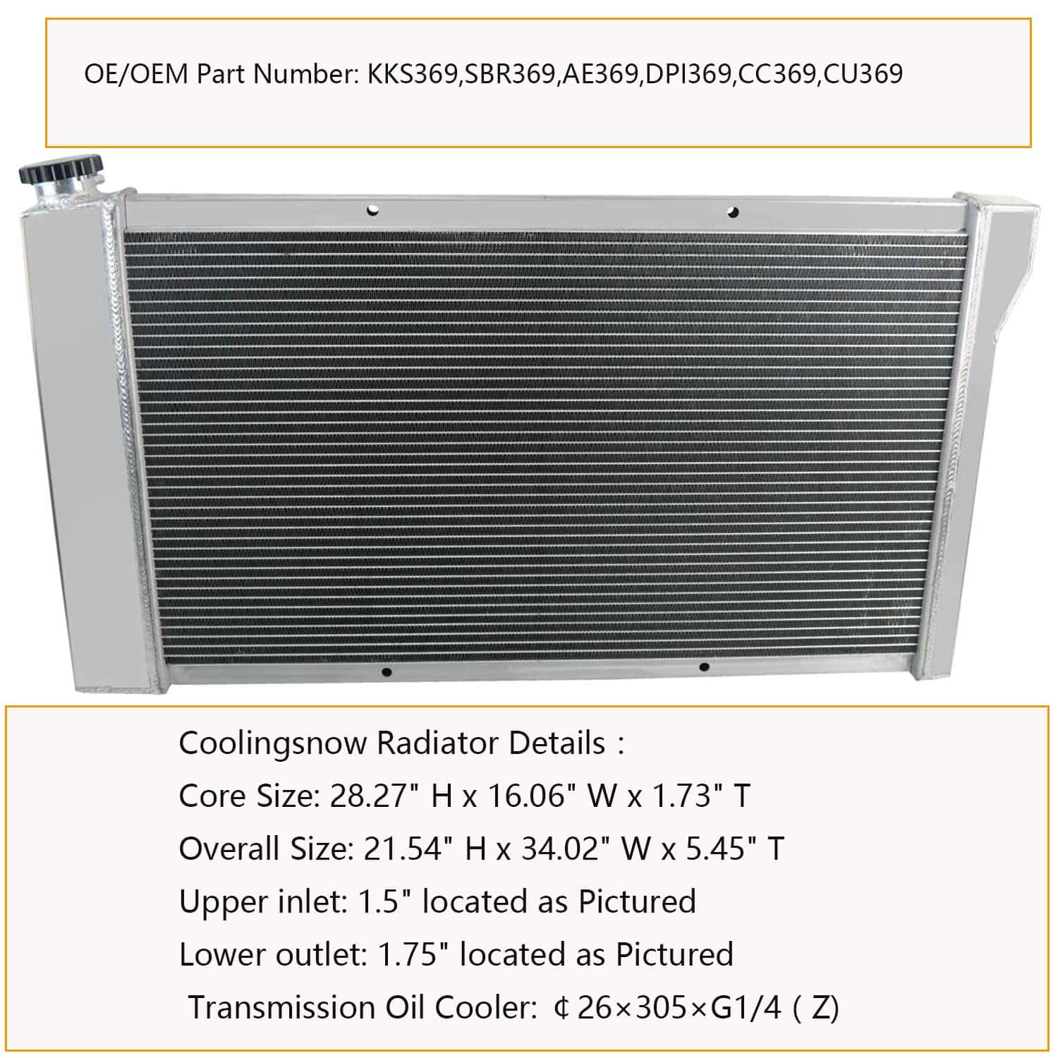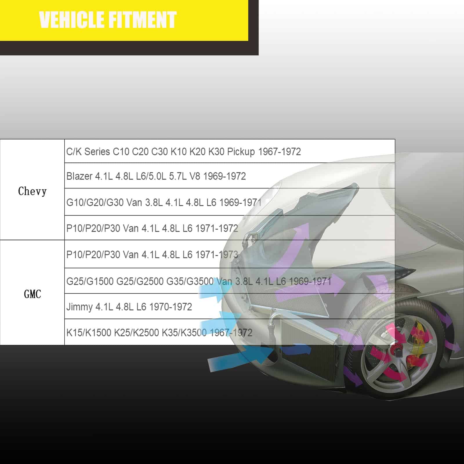 Radiador de aluminio CoolingSnow para Chevy Blazer 1969-1972, Chevy C10 Pickup 1968-1972, Chevy C20 Pickup 1968-1972, Chevy C30 Pickup 1968-1972, Chevy K10 Pickup 1968-1972, Chevy K20 Pickup 1968-1972, GMC C15/C1500 Pickup 1968-1972, GMC C25/C2500 Pickup 1968-1972, GMC C35/C3500 Pickup 1968-1972, entre otros. Fabricado con material de aluminio de alta calidad, resistente y duradero. Fácil de instalar, ofrece máxima eficiencia de enfriamiento, alta seguridad y rendimiento.