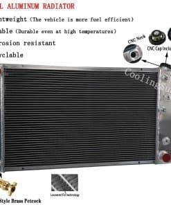 Radiador de aluminio de 3 filas COOLINGBEST diseñado como reemplazo OEM para una variedad de modelos de Chevy, incluidos Caprice, Chevelle y Chevy Truck. Este radiador ofrece un tamaño de núcleo de 17″ de ancho por 28 1/4″ de alto y un tamaño total de 18 5/8″ de ancho por 33″ de alto, con un grosor de núcleo de 1 3/4″ para una capacidad óptima de enfriamiento. Las especificaciones del enfriador de aceite son 32 215 G1/4(Z), con entrada superior de 1 1/2″ en el lado del conductor y salida inferior de 1 1/2″ en el lado del pasajero para una instalación conveniente y eficiente.