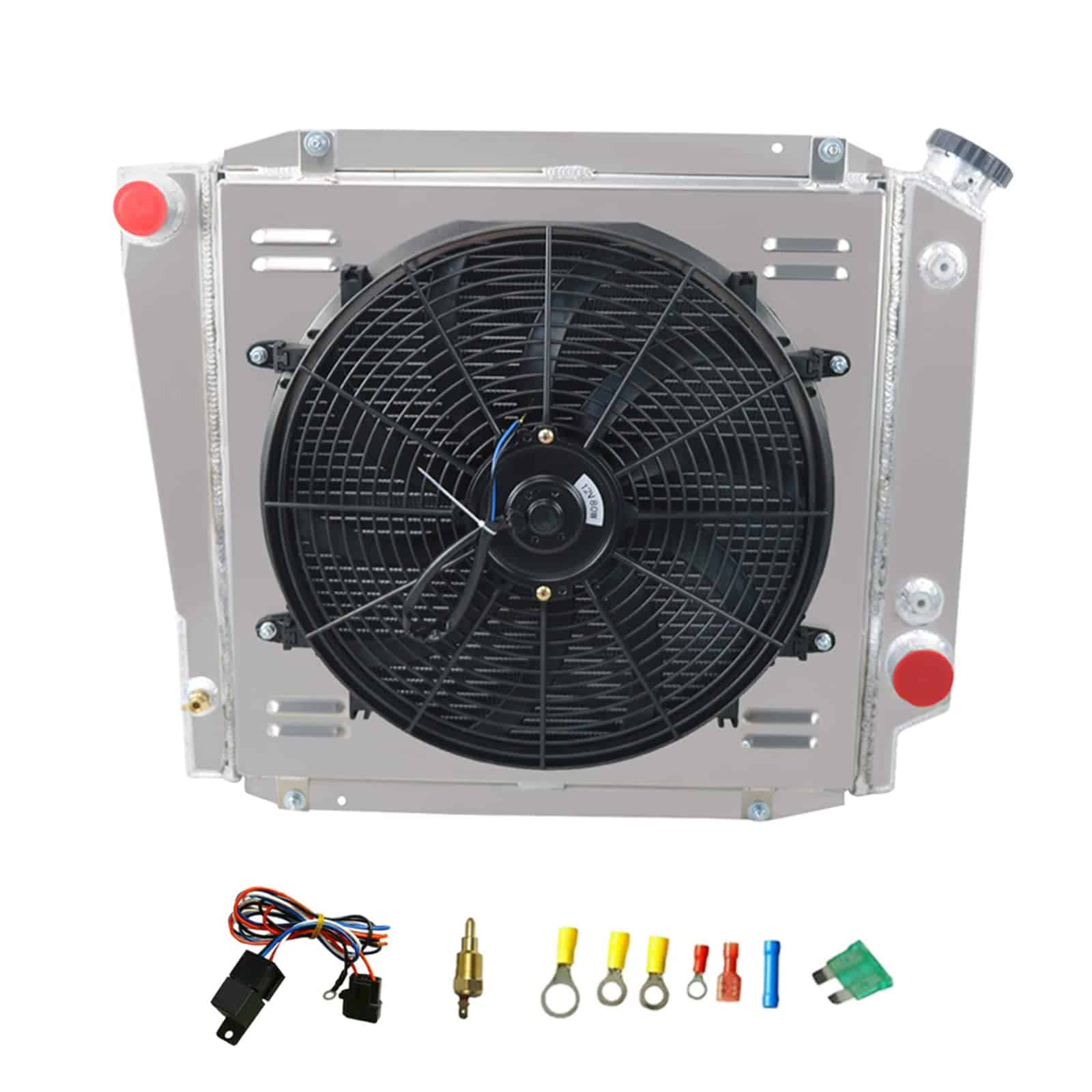 Este listado incluye 1 X Radiador de aluminio de 3 filas (Incluye tapa de radiador) 1 X Carcasa de aluminio 1 X Ventilador de 16″ (Incluye kits de montaje) 1 X Kit de relé de termostato Detalles del radiador Núcleo de fila: 3 filas Material del núcleo: Aluminio completo Material del tanque: Aluminio completo Tapa del radiador: Incluida Flujo del radiador: Flujo descendente Tipo de montaje: Atornillado Tipo de ajuste: Reemplazo directo Los tanques están soldados al 100% por TIG Cuello de llenado mecanizado por CNC y tapón Válvula de desagüe de latón de estilo OEM Ventilador de especificación de alto rendimiento CFM máximo del ventilador: 2000 CFM máximo del ventilador: 16.050 pulgadas Grosor: 2.790″ Número de aspas: 10 aspas RPM máximo del ventilador: 2,250 RPM Material de la hoja: Plástico Amperaje de dibujo: 12.70 amperios Incluye las pestañas de montaje para una fácil instalación con bridas Instrucciones del kit de relé ROJO + se conecta directamente a la batería El cable BLANCO a la fuente de alimentación del interruptor de encendido El NEGRO va al interruptor térmico El cable AZUL va a los ventiladores Por qué elegir el radiador CoolingSnow 1. Máxima eficiencia de enfriamiento 2. Alta seguridad y rendimiento 3. Excelente material de aluminio 4. Estabilidad y durabilidad 5. Instalación directa 6. Resistencia a altas temperaturas 7. Paquete de protección mejorado Número de pieza 521, CC521, EC521, DPI521, MC521