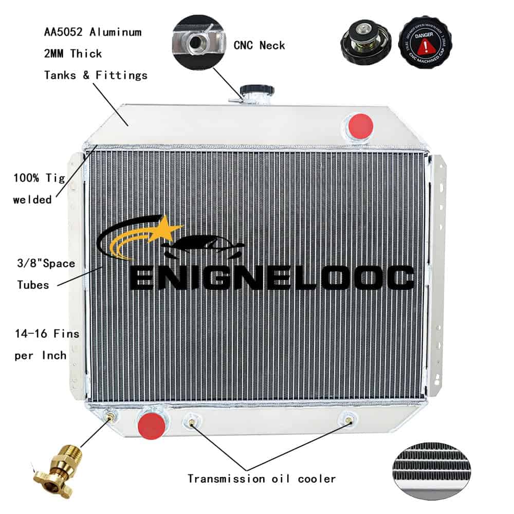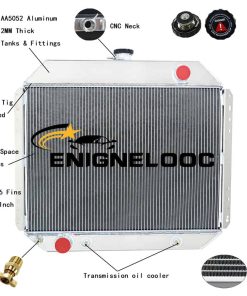 Tamaño del radiador: Especificación de carreras de alto rendimiento; 3 filas de diseño de carreras de tubos núcleo; Tamaño del núcleo: 29,52L» x 26,18W» x 5,5T»; Tamaño total: 18,89H» x 25,9W» x 1,73T»; Diámetro de entrada: 1,77″; Diámetro de salida: 1,96″; Conexión de la manguera superior: PASAJE; Conexión de la manguera inferior: CONDUCTOR; Detalles del enfriador de transmisión: 1/8-27NPT; Tipo de montaje: SOPORTE; Especificaciones de montaje: Ver – 16 1/2 Horizontal – 27 3/8; Desagüe de petcock: Desagüe de la llave de paso estilo OEM de latón; Tapa del radiador: Cuello de llenado y tapa fresados CNC; Características: 1. Fabricado con aluminio de grado aeronáutico AA5052 para una vida útil prolongada y con acabado de aluminio crudo. 2. Tecnología de núcleo brazado para garantizar un rendimiento y una fiabilidad óptimos. 3. Todos los tanques y accesorios de aluminio AA5052 de 2 mm de espesor, aseguran que sean robustos y duraderos. 4. Cuello de llenado mecanizado por CNC de aluminio billet resistente y duradero. 5. Diseño ergonómico tapa mecanizada por CNC con artesanía grabada, tratamiento anodizado. 6. Desagüe de llave de paso estilo OEM de latón mucho mejor que otros de plástico. 7. Cuidadosamente elaborado para cumplir con los estándares OE excepcionales para un ajuste preciso. Compatibilidad del vehículo: Para Ford F-Series/Bronco Truck V8 1966-1979; Para Ford Bronco 1978-1979 (351ci V8, 400ci V8); Para Ford F-Series Truck 1968-1969 (4.9L Straight 6 cilindros, 360ci V8, 390ci V8); Para Ford F-Series Truck 1970-1972 (360ci V8, 390ci V8); Para Ford F-Series Truck 1973-1975 (302ci V8, 360ci V8, 390ci V8); Para Ford F-Series Truck 1976 (302ci V8, 351ci V8); Para Ford F-Series Truck 1977-1979 (302ci V8, 351ci V8, 400ci V8). Incluye: 1 x Radiador de aluminio AA5052 de 3 filas; 1 x Tapa de radiador mecanizada por CNC