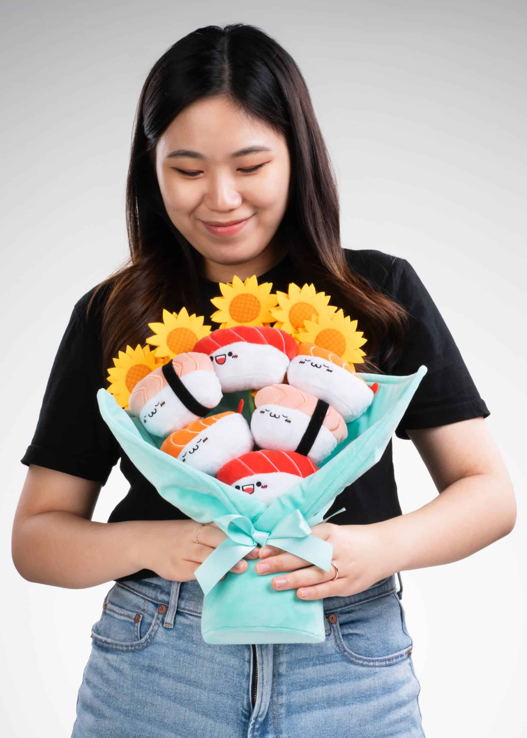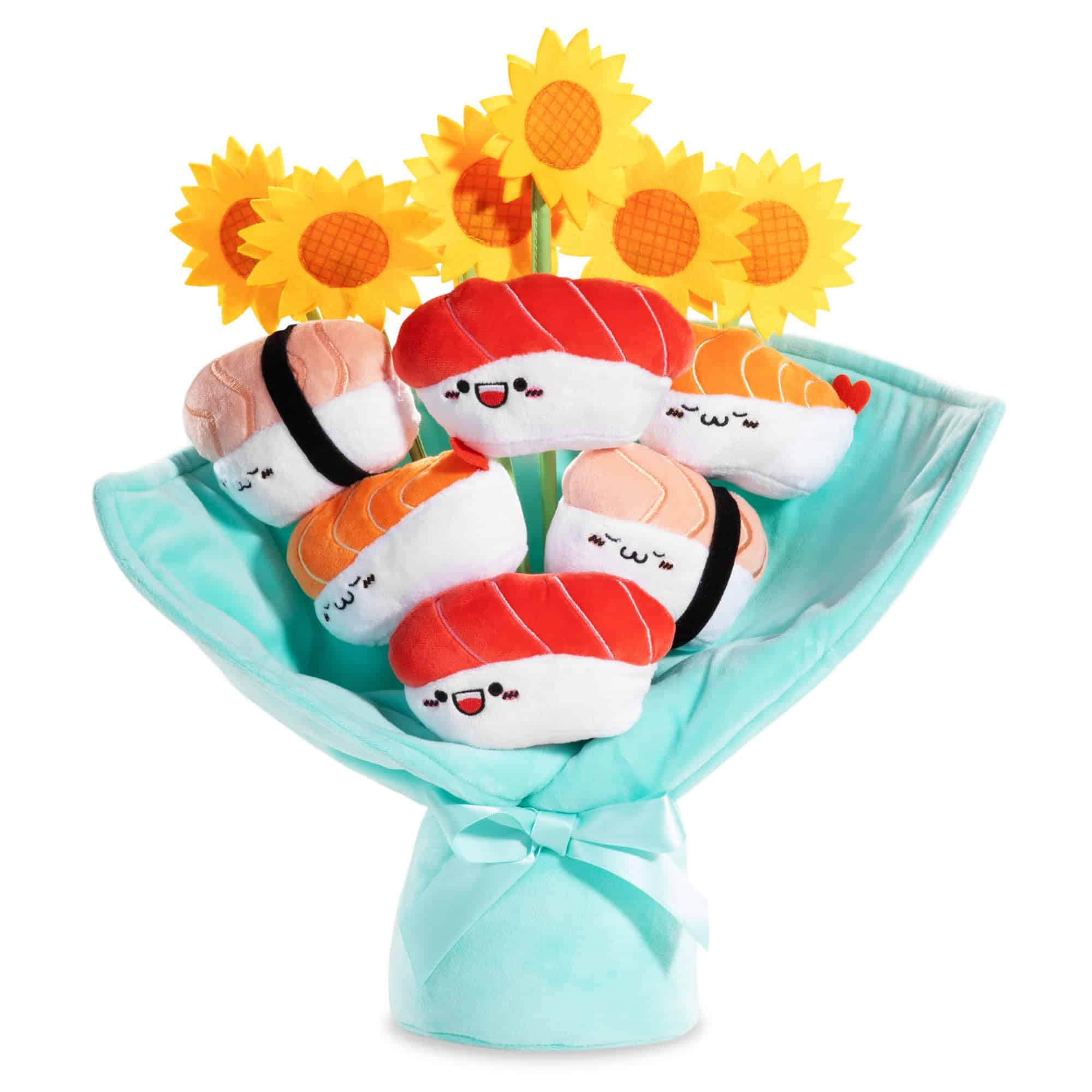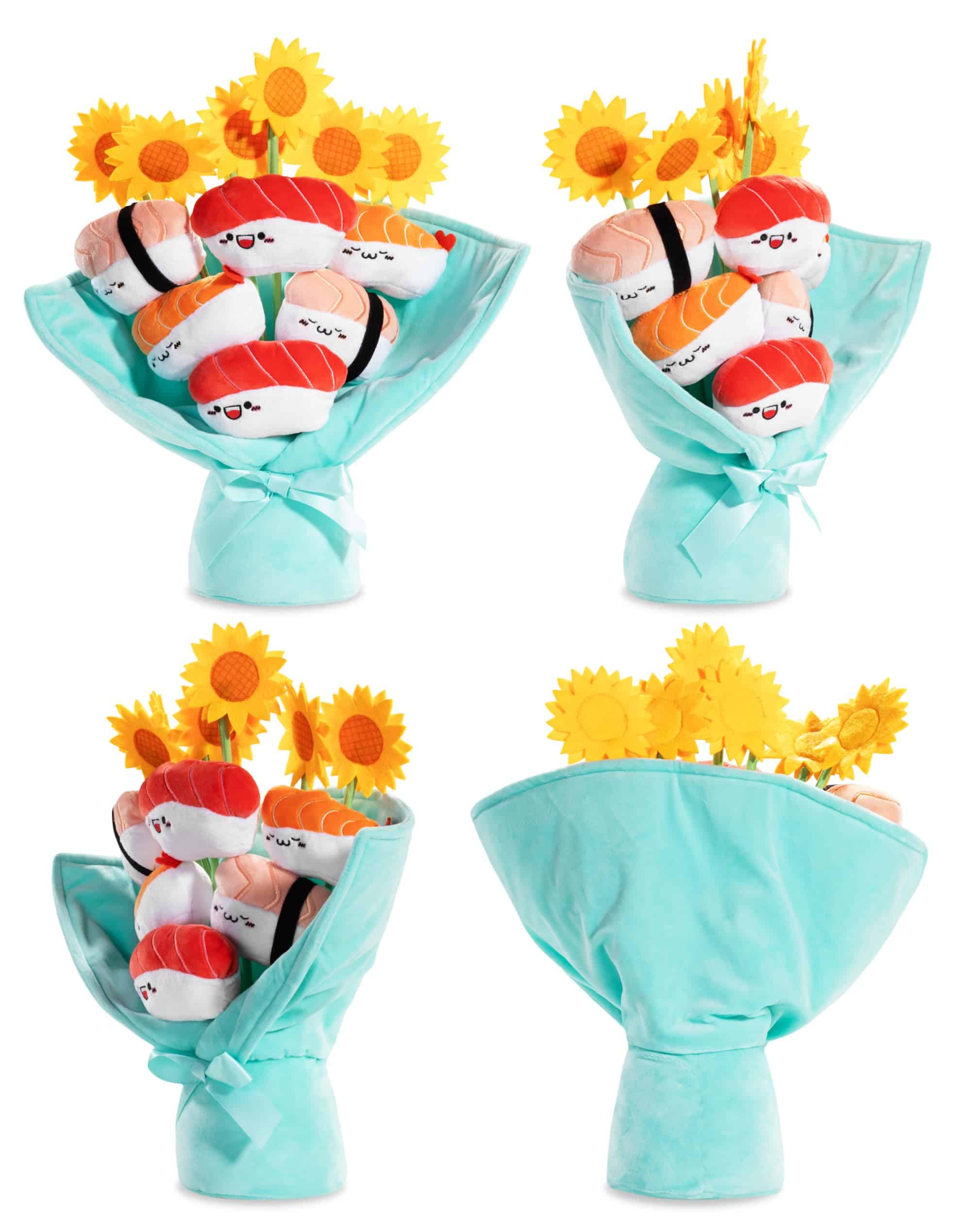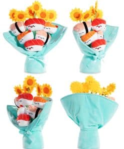 ¿Por qué regalar flores cuando puedes regalar un ramo de SUSHI que nunca muere? Nuestros únicos ramos de peluche hacen el regalo perfecto…Rollitos de sushi de peluche con expresiones kawaii bordadas y detalles están unidos a un tallo y rodeados de alegres girasoles de fieltro. Envolvimos este conjunto de ternura con un papel de terciopelo súper suave y lo atamos con un lazo de satén…¡Como un ramo real! Regala las flores más únicas que recibirán.