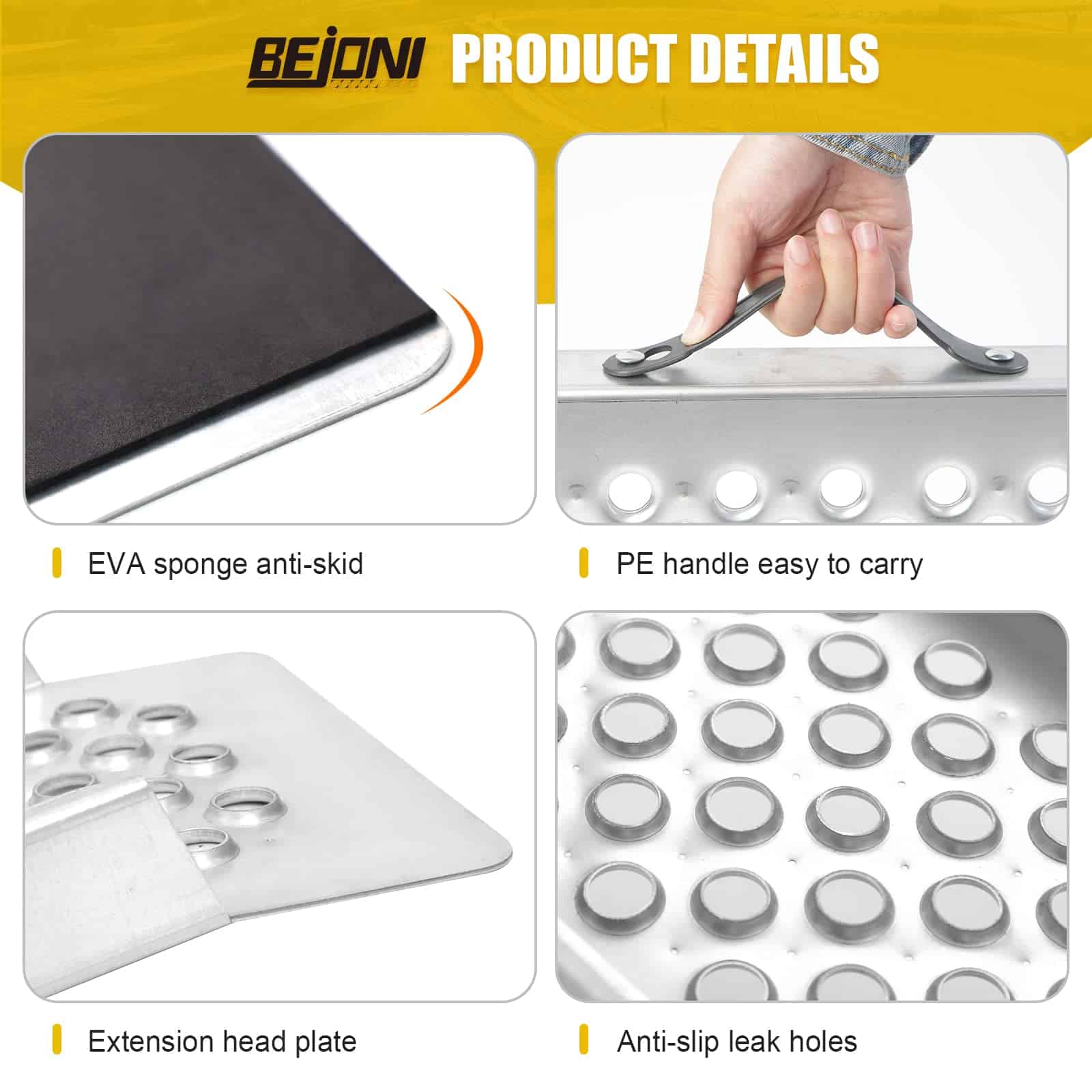 3. Superficie Antideslizante para Seguridad: La superficie de la rampa cuenta con un diseño de perforación que mejora la tracción y evita el deslizamiento, incluso en condiciones de lluvia o nieve. Mantiene su trabajo de carga seguro en cualquier condición. Ideal para rampa portátil y rampa para cobertizo.