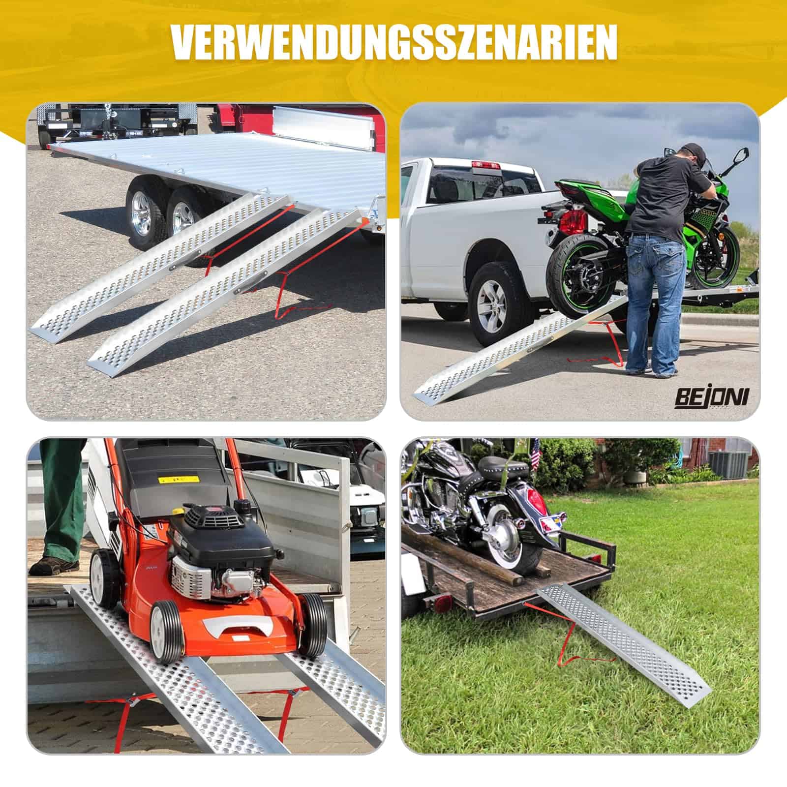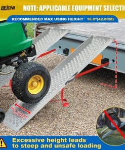 5. Rampa de Carga Versátil: Ideal para cargar motocicletas, cuatrimotos, bicicletas y otros vehículos de dos ruedas sobre escalones. También es ideal para equipos pequeños como sopladores de nieve o cortacéspedes. Adecuado como rampas para cobertizo para cortacésped y rampas para camioneta para cortacésped