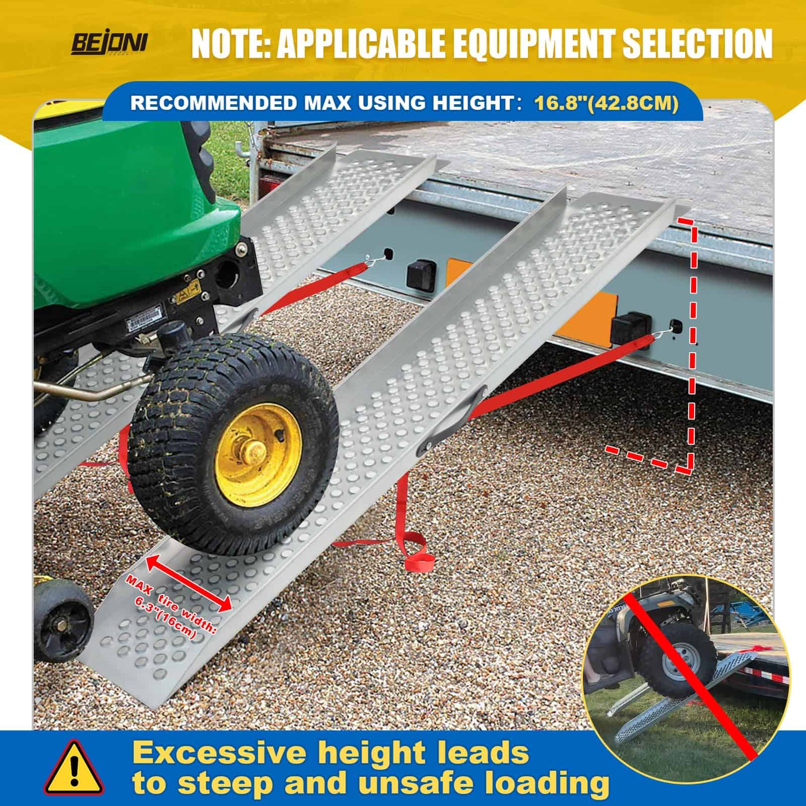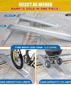 1. Compatible con Varios Vehículos: Nuestras rampas para motocicletas están diseñadas para vehículos con anchos de neumáticos de hasta 6.3″ (16cm). La altura máxima de uso es de 16.8″ (42.8cm). Acomoda motocicletas, cuadrimotos y otros vehículos de dos ruedas. Perfecto como rampa para cobertizo y rampas para camionetas.
