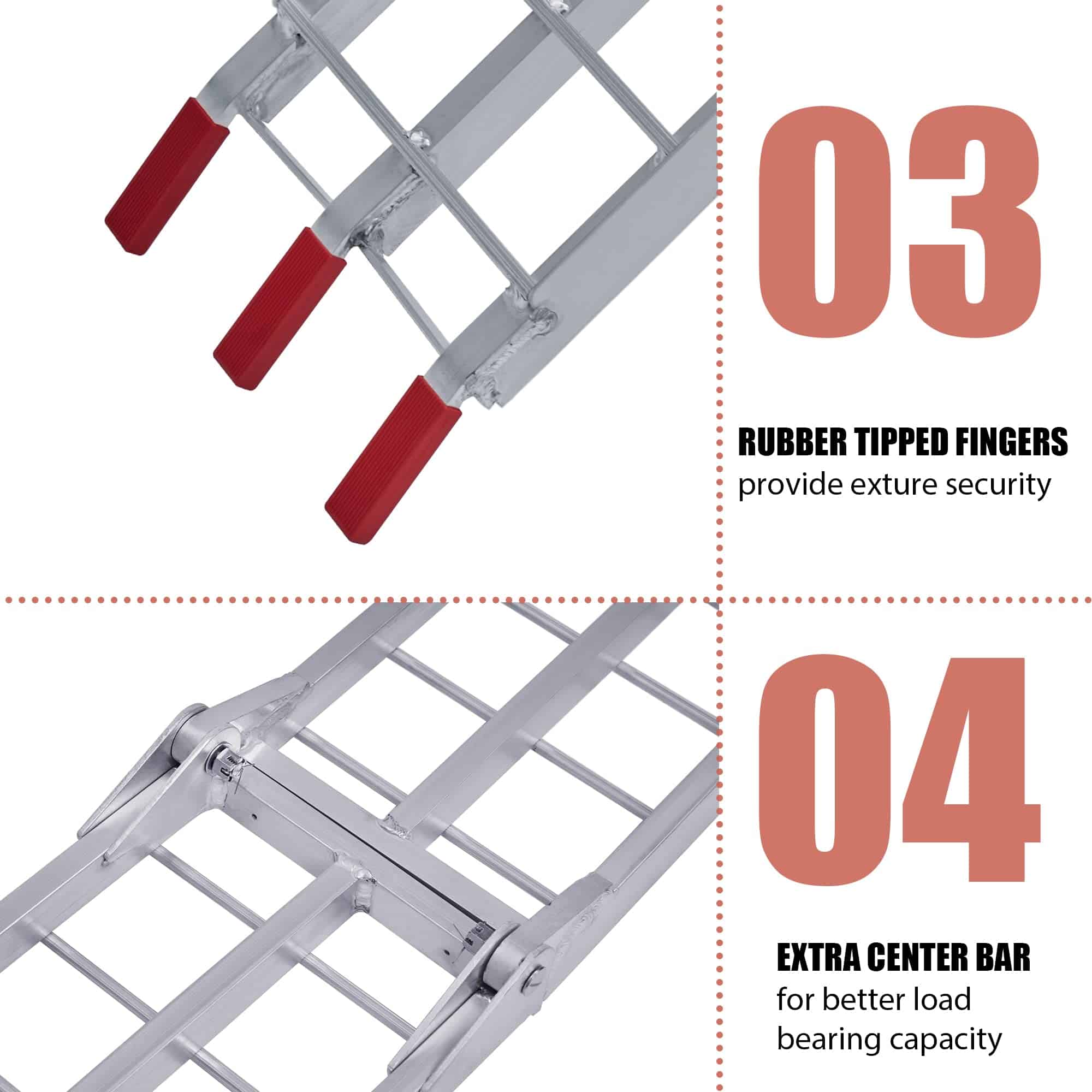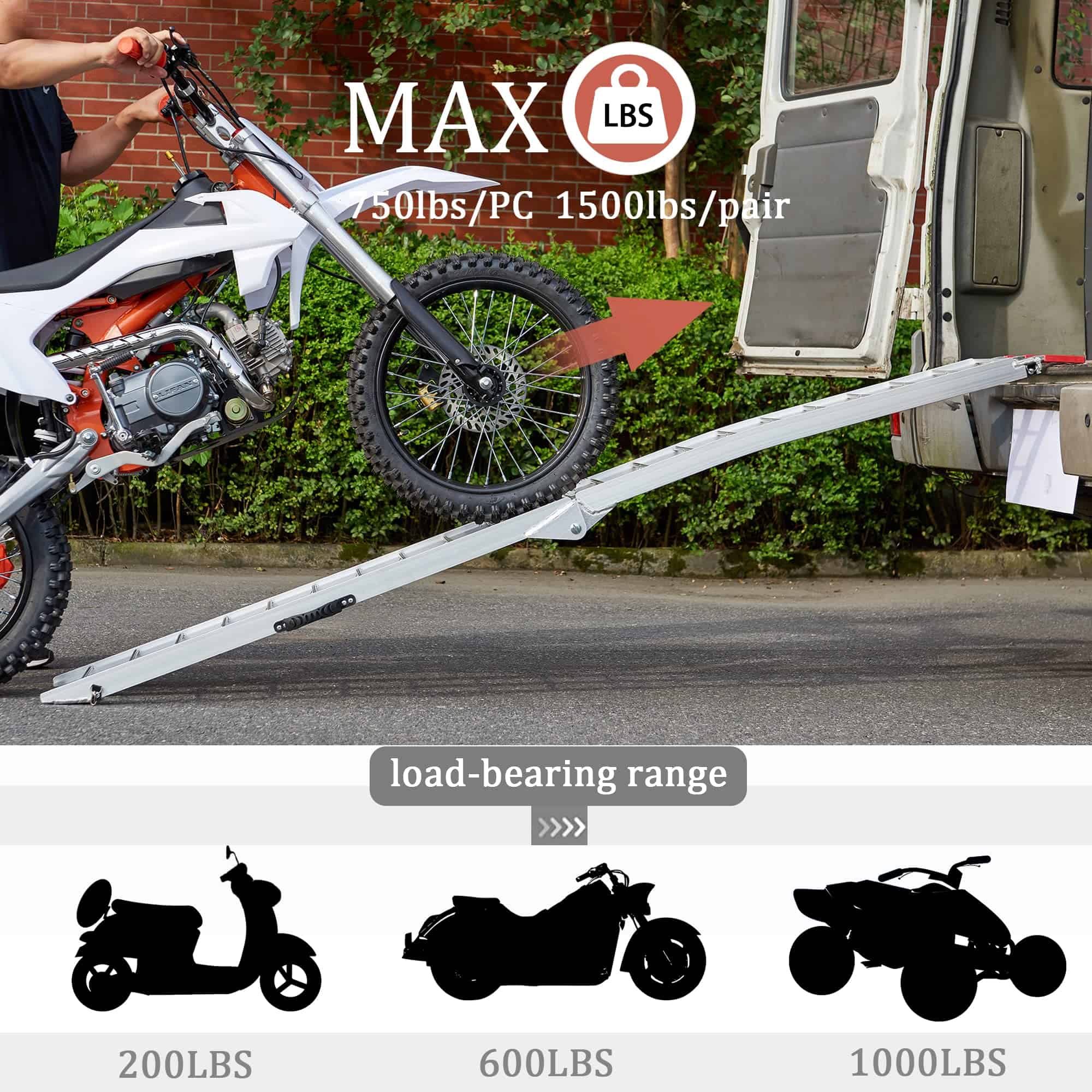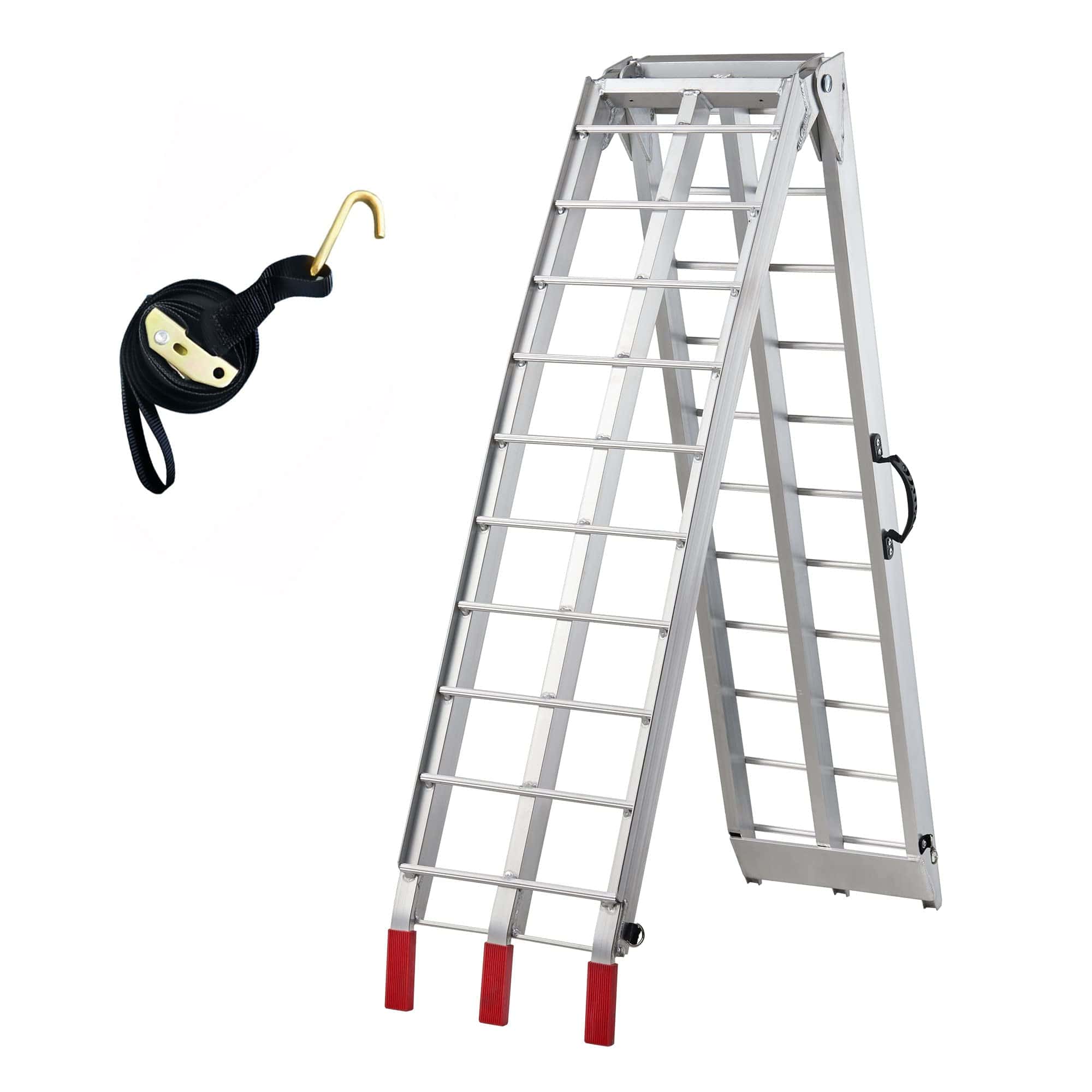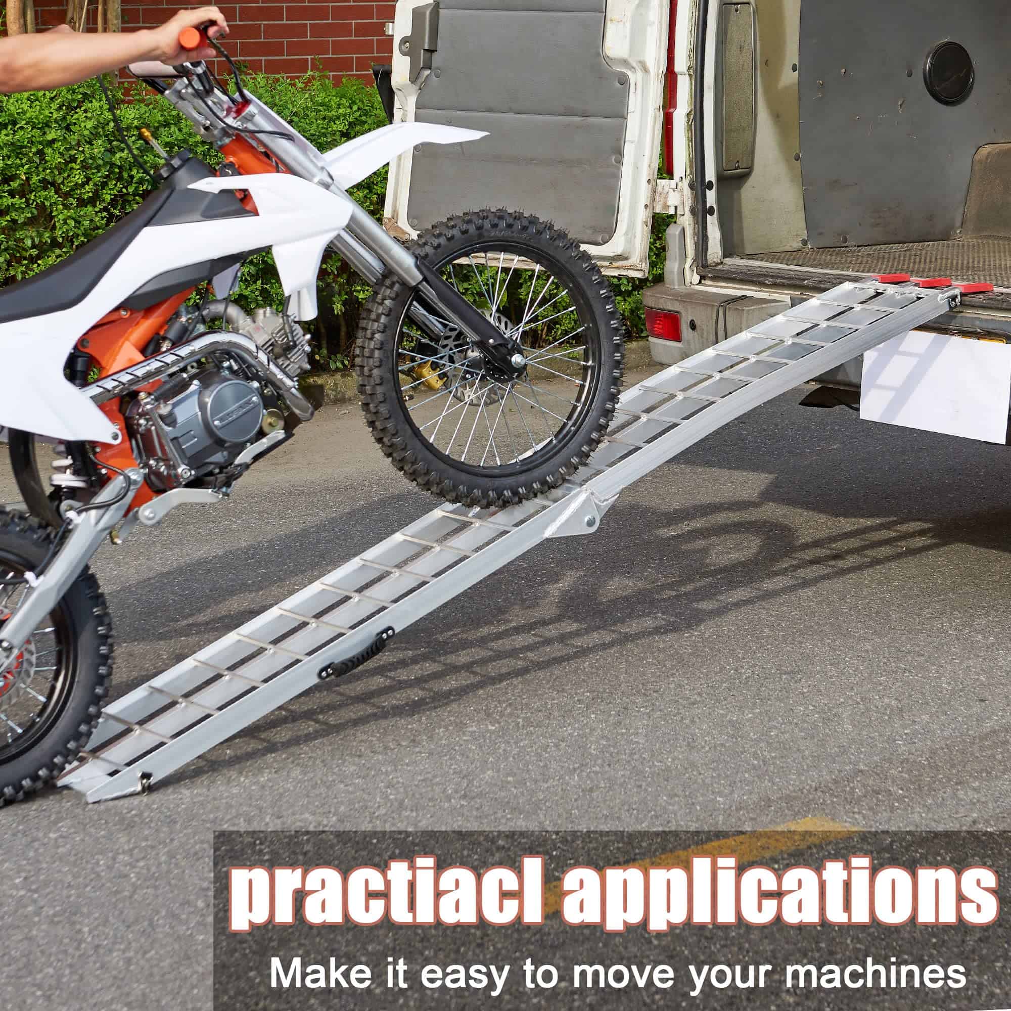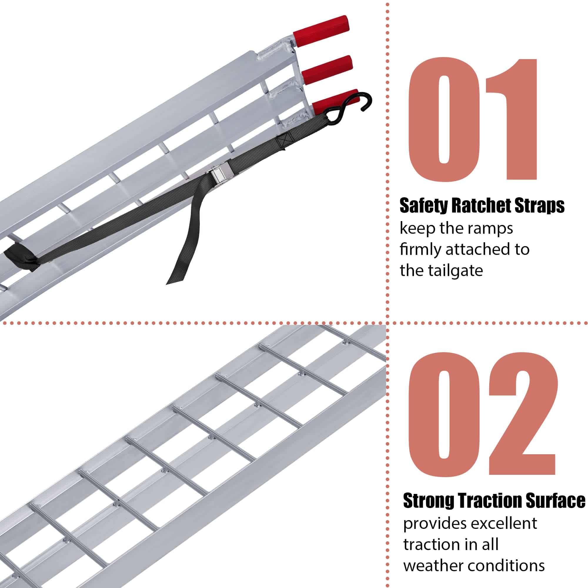 2. CONSTRUCCIÓN DE ALUMINIO COMPLETO Fabricadas en rampas de aluminio sólido con bisagras, uniones y travesaños de servicio pesado, soldados entre sí y que se pueden plegar y desplegar innumerables veces sin fallas, lo que hace que las rampas sean aún más resistentes y duraderas. Una rampa puede transportar motocicletas, y dos rampas se utilizan para cargar ATVs, quads o cortacésped en la caja de la camioneta. Con una capacidad de peso de 750 libras, una rampa es robusta y versátil.