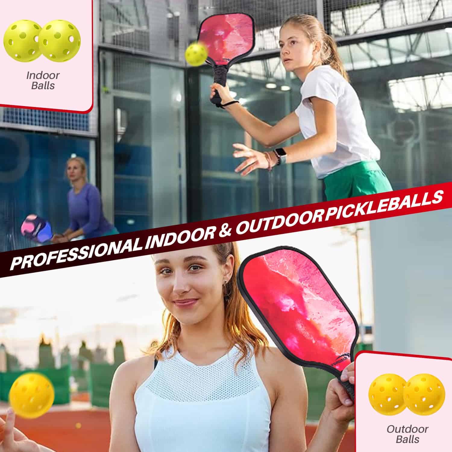 Raqueta de Pickleball Vsmooth Ligera Aprobada por USAPA Set de Pickleball de Fibra de Vidrio con 4 Pik Balls Tecnología Avanzada con Superficie Texturizada Raqueta de Pickleball Totalmente Encapsulada con un Punto Dulce más Grande. Esta raqueta de pickleball te ofrece un mango cómodo con control total que tiene un mango de 4.72 pulgadas de largo y está diseñada con orificios de ventilación que absorben el sudor para reducir el riesgo de que la raqueta se resbale, brindándote un movimiento de muñeca perfecto y rotación flexible. El mango está hecho de material de cuero artificial, que proporciona un agarre cómodo y es resistente al desgaste y duradero, permitiéndote no sentirte cansado incluso durante el ejercicio prolongado. Además, es un regalo de pickleball perfecto para principiantes, ya que este set de Pik Ball incluye: 2 raquetas de pickleball, 2 pickleballs para exteriores, 2 pickleballs para interiores, 1 bolsa portátil, que básicamente puede satisfacer todos los requisitos para que los principiantes jueguen. La raqueta está hecha de material de fibra de vidrio de alta calidad, que es ligero, resistente y duradero, permitiéndote no sentir fatiga en el brazo durante el juego. Tiene un protector de borde superior que protege los bordes de la raqueta de arañazos y marcas, prolongando su vida útil. El protector de borde de material plástico maduro es ligero y resistente, lo que no agregará peso extra a tu raqueta y no afectará el equilibrio al balancear la raqueta. Además, el servicio postventa es de alta calidad, ya que si no estás satisfecho con los productos recibidos, el equipo de Vsmooth proporcionará un servicio de garantía de devolución e intercambio gratuito de un año. Si tienes alguna pregunta, no dudes en contactarnos y te responderemos en un plazo de 24 horas y te proporcionaremos un servicio postventa de alta calidad!