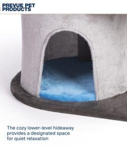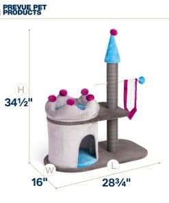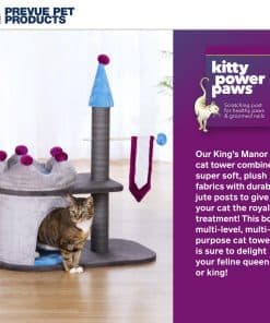 Prevue Pet Products King’s Manor 7350 combina telas súper suaves y peludas con resistentes postes de yute para darle a tu gato el tratamiento real! ¡Un cojín suave y aterciopelado en la parte superior de un castillo proporciona el lugar perfecto para que tu gato duerma, descanse y supervise su reino! ¡Observa a tu gatito participar en actividad enérgica jugando con la bandera colgante y pompones de peluche! Los postes de rasguño de cuerda de yute ofrecen una textura atractiva para los gatos, frenando comportamientos inapropiados de rasguñar y salvando tu sofá. Este mueble para gatos de felpa fomenta el ejercicio mientras tu gato rasguña, se estira, cuida sus uñas y fortalece sus patas. La acogedora guarida de nivel inferior proporciona un espacio designado para relajarse. ¡Nuestro caprichoso King’s Manor agrega una presencia regia a cualquier habitación! En gris, azul claro y tonos llamativos de fucsia, esta torre multi-nivel, multi-propósito para gatos seguramente deleitará. Medidas 28 3/4″ L x 16″ W x 34 1/2″ H.
