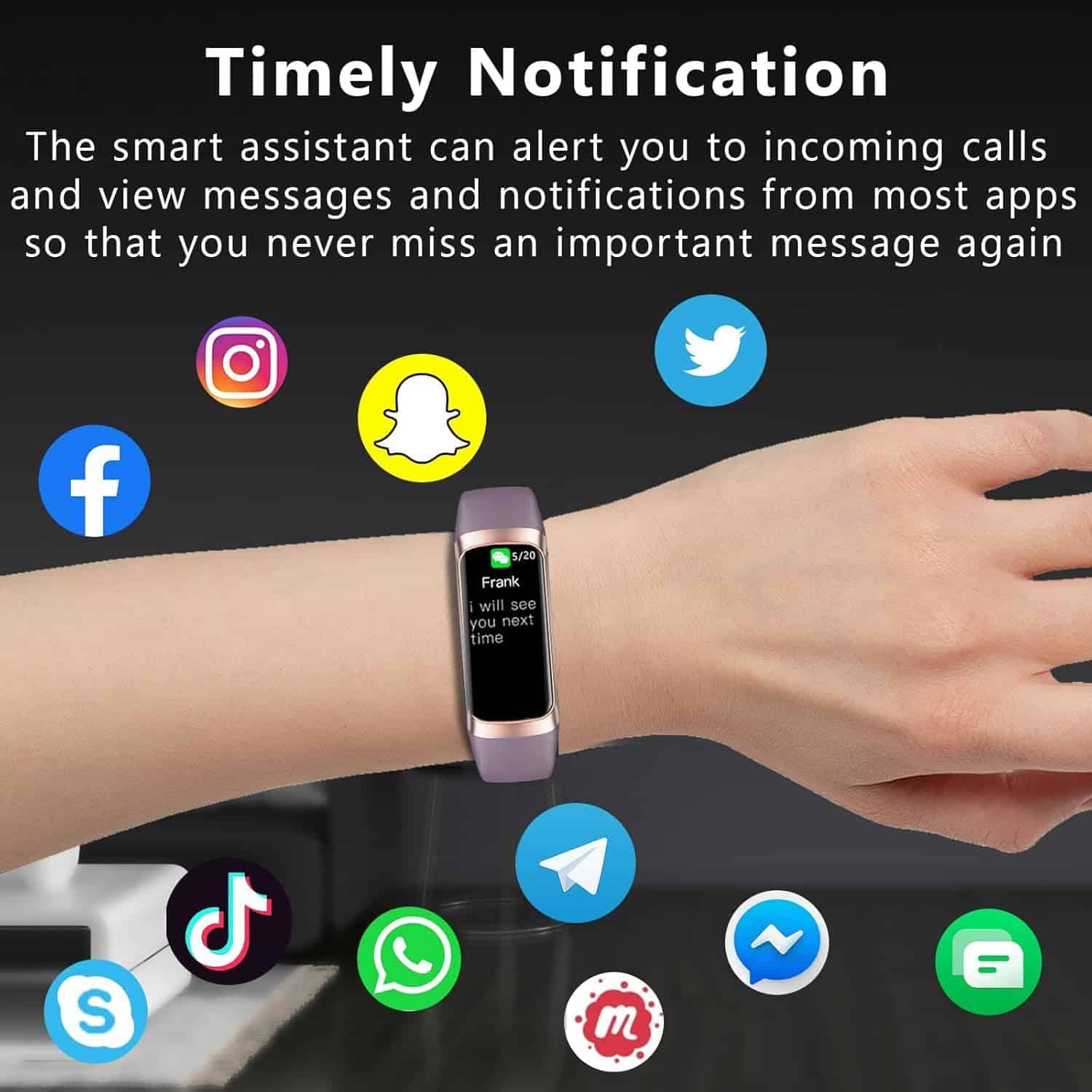 4. Recordatorio Inteligente y Asistente Versátil Un rastreador de actividad de fitness fácil de usar con varias funciones inteligentes. Incluyendo Recordatorio de Llamada y Mensaje, Fotografía Remota, Recordatorio de Beber Agua, Recordatorio de Sedentarismo, Salud Femenina, Salud Familiar, Alarma, Cronómetro, Encontrar Dispositivo, etc.
