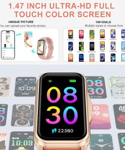 Rastreador de fitness con ritmo cardíaco 24/7 y medición de presión arterial y oxígeno en sangre. Este reloj de salud para mujeres y hombres también ofrece seguimiento de actividad durante todo el día, incluyendo calorías, pasos y distancia en tiempo real. Con pantalla táctil HD de 1.47″, más de 150 opciones de esfera de reloj para elegir, notificaciones inteligentes, asistente versátil y una larga vida útil de la batería. Impermeable IP68 para actividades diarias y deportes.
