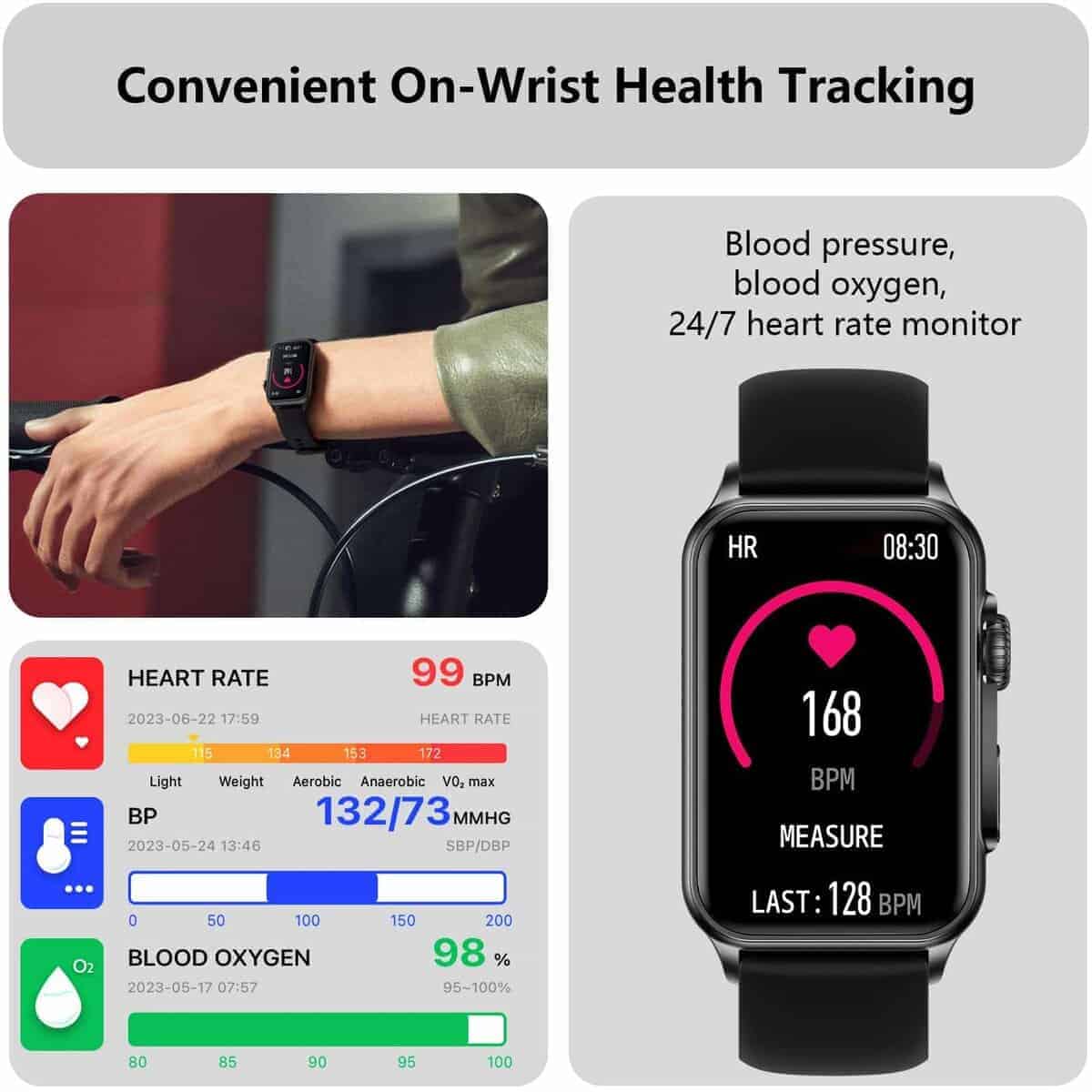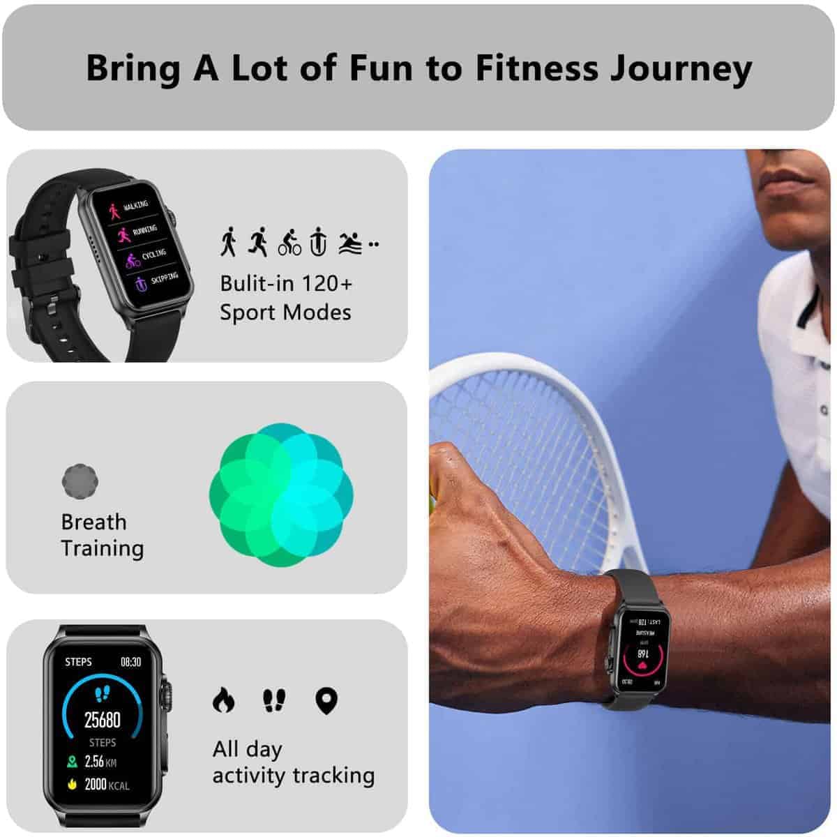 3. MEJORA TUS ENTRENAMIENTOS: Disfruta de más de 120 modos deportivos integrados diseñados para satisfacer tus necesidades diarias de ejercicio a diferentes intensidades. Lleva un registro de los pasos, calorías quemadas, frecuencia cardíaca y distancia recorrida. Crea un régimen de entrenamiento personalizado añadiendo tus deportes favoritos al reloj. Con su calificación IP67 resistente al agua, el smartwatch es seguro para actividades acuáticas y uso en días lluviosos.