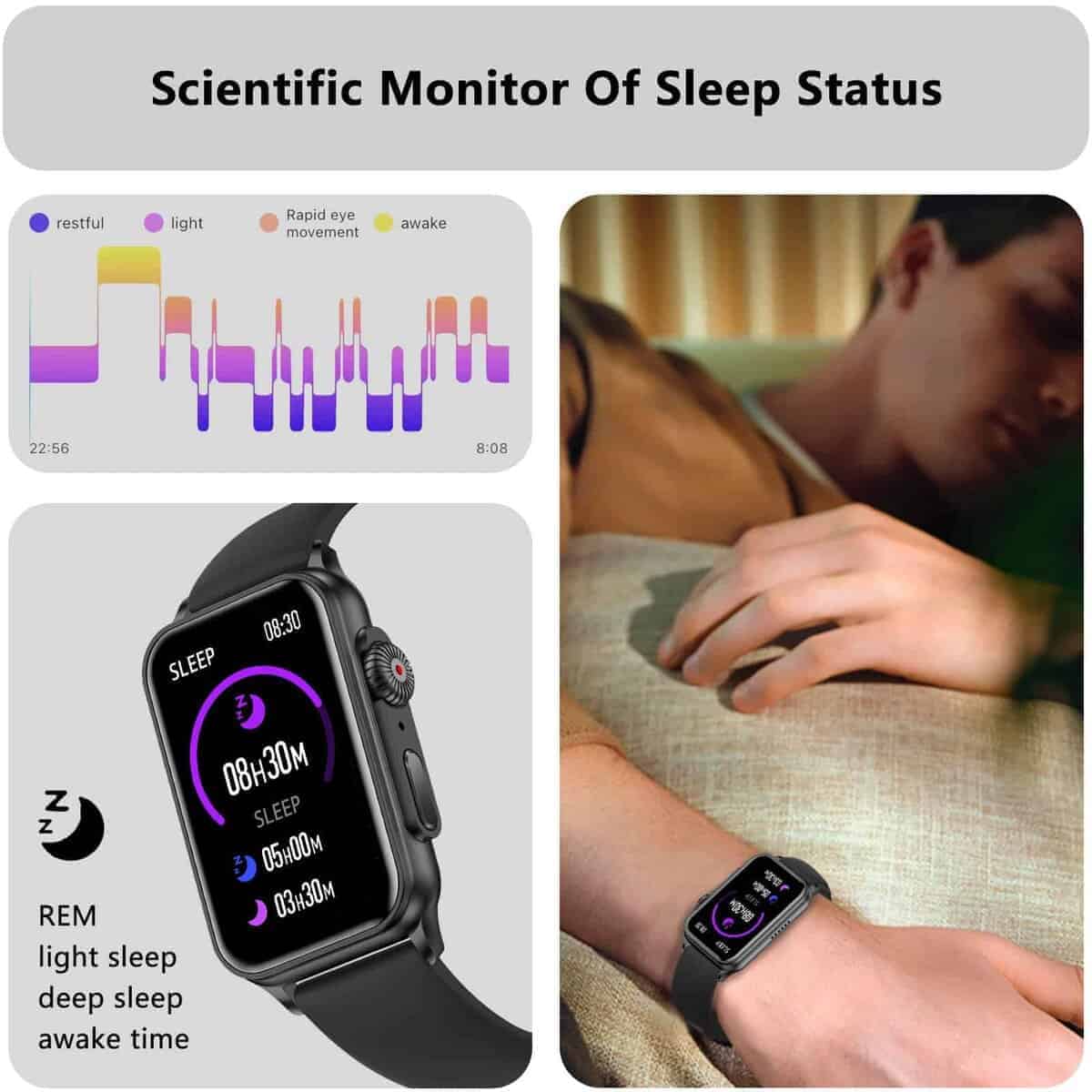 2. SEGUIMIENTO DE SALUD TODO EL DÍA: Obtén una comprensión más profunda de los datos de tu cuerpo con el rastreador de actividad de fitness de todo el día AviiHoug. Monitorea en tiempo real la frecuencia cardíaca, la presión arterial y los niveles de oxígeno en sangre directamente en el reloj, y accede a registros detallados de datos en la aplicación. (solo para referencia, no pretende ser utilizado con fines médicos) El rastreador revela la estructura completa de tu sueño, incluidas las fases REM, sueño ligero, sueño profundo y tiempos de despertar, lo que permite una mejor comprensión de la calidad de tu sueño.