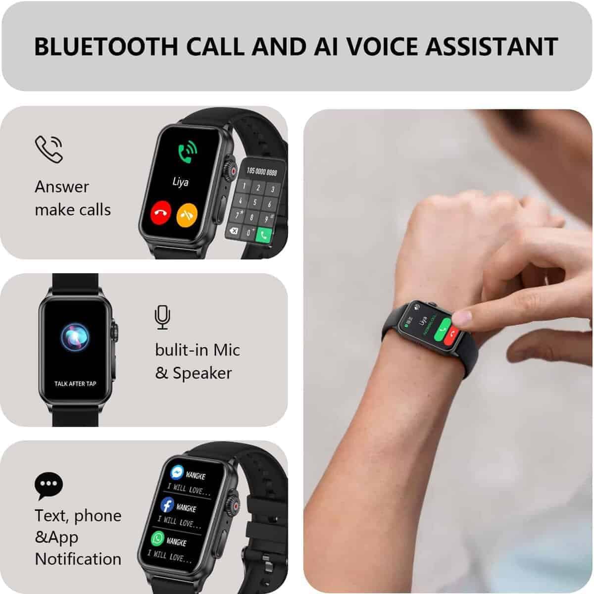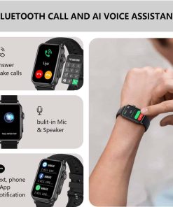 1. BLUETOOTH CALL&VOICE ASSISTANT: Actualiza tu experiencia de fitness con el rastreador de fitness AviiHoug que cuenta con tecnología Bluetooth avanzada, lo que te permite realizar y responder llamadas directamente desde tu muñeca. Mantente conectado con registros de llamadas y contactos, y recibe alertas de llamadas, mensajes y notificaciones en movimiento. Experimenta un compañero más atento con nuestro asistente de voz de inteligencia artificial. Comprueba rápidamente el clima, reproduce música, realiza llamadas o configura alarmas usando comandos de voz.