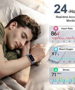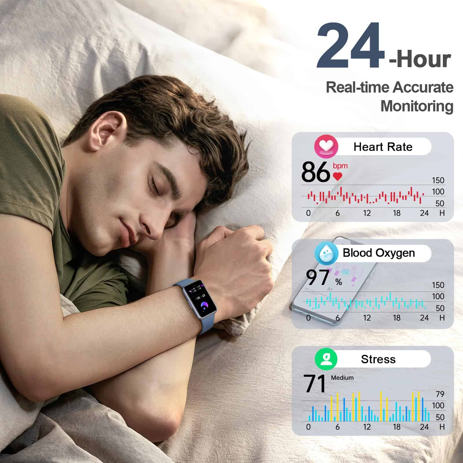4. Fitness día y noche: El rastreador de actividad mide todo el día las calorías quemadas, los pasos y la distancia. Utiliza 20 modos deportivos para ejercitarte de manera científica y mejora tus entrenamientos registrando el ritmo cardíaco, las calorías y más. Puntuación de sueño nocturno: Un mejor sueño puede potenciar tus días. Realiza un seguimiento de tu tiempo en sueño ligero y profundo para entender mejor la calidad de tu sueño cada noche.