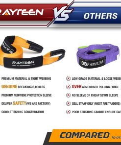 4. MATERIAL SUPERIOR Todas las cuerdas de remolque de recuperación de RAYTEEN son fabricadas con poliéster PREMIUM TOTALMENTE NUEVO para garantizar su rendimiento y la seguridad de los usuarios, mientras que otras marcas utilizan material de segunda mano y sobrepublicitan hasta el 50% de su resistencia a la rotura.