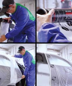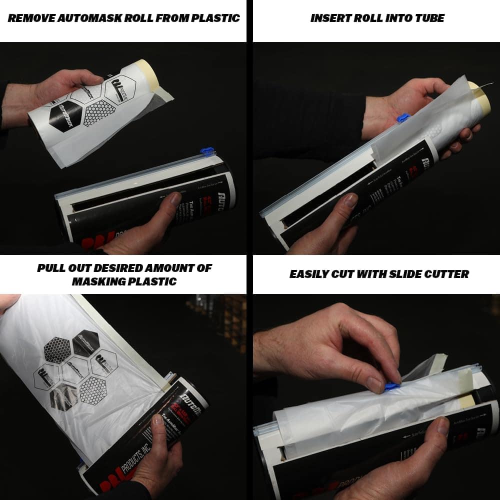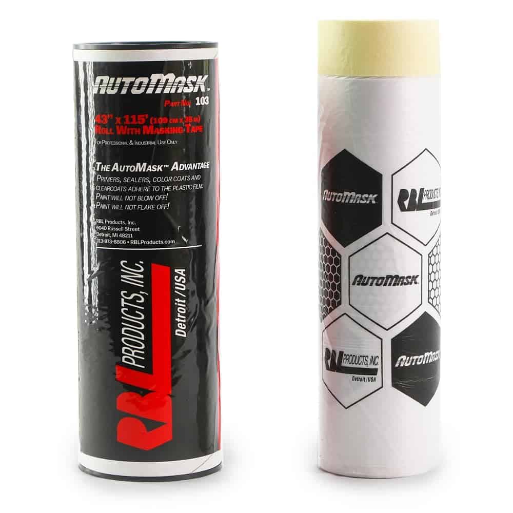 El sistema de enmascaramiento de pintura pre-cinta, pre-doblado, y portátil que permite a una persona enmascarar longitudes ilimitadas, de manera rápida y precisa, en todos los vehículos, reduciendo el tiempo de enmascaramiento y el desperdicio de material. Completamente impermeable. El Film Plástico AutoMask y Superdimesionado AutoMask es reciclable. El sistema AutoMask y Superdimesionado AutoMask utiliza cinta de enmascarar de calidad automotriz de 3/4″ y 1/2″ – superior flexibilidad, resiste la división, fácil de quitar, sin transferencia de adhesivo. La overspray de pintura se adhiere al film. Fuerte, libre de estática. Resistencia máxima al sangrado de solventes. Incluso el decapante de pintura no puede penetrarlo. Compactibilidad – se arruga en pequeñas bolas desechables que ahorran espacio. Reduce el espacio de eliminación hasta un 70%. Resiste el calor hasta 230 F (110 C). Elija el drapado de enmascaramiento AutoMask correcto para sus necesidades de enmascaramiento. RBL Products 103 43 pulgadas x 115 pies AutoMask Roll con Dispensador