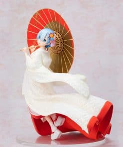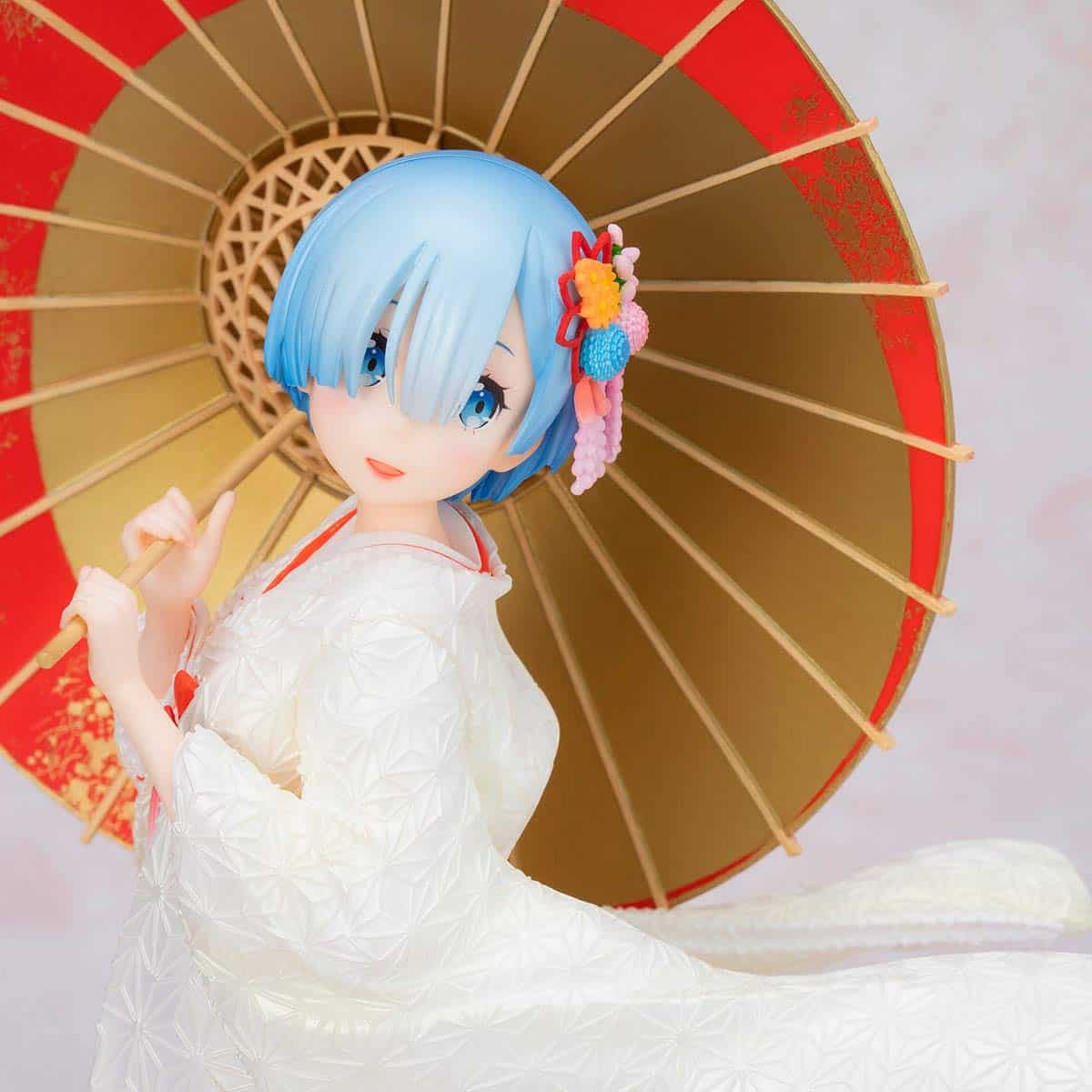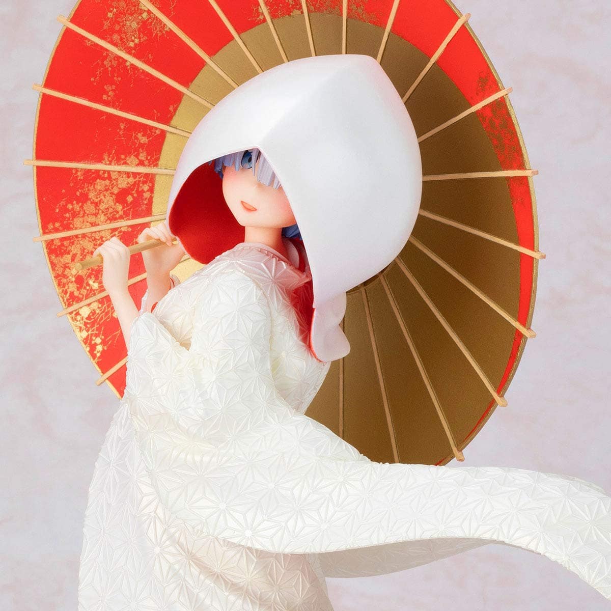 Desde FuRyu. Desde la serie de anime Re: ZERO -starting life in another world- llega una figura a escala 1/7 de una de las criadas que sirve en la Mansión Roswaal, ¡Rem! ¡Presentada aquí en un estilo japonés de boda tradicional shiromuku, sostiene un elegante paraguas sobre su hombro! ¡Esta tímida novia Rem mide 10.9″ de altura con su paraguas e incluye también una capucha tradicional removible para que puedas elegir la forma en que se muestra!