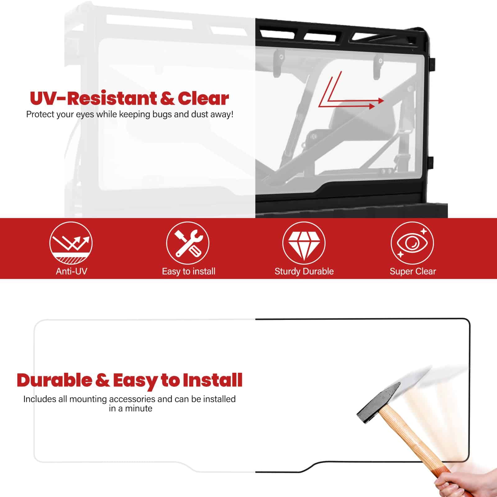 Parabrisas Compatible con Polaris Ranger, Aumenta tu visibilidad y protección durante tus excursiones todoterreno con nuestro parabrisas trasero de alta calidad. Este parabrisas transparente está diseñado para adaptarse perfectamente a los modelos Polaris Ranger XP 1000/XP 1000 Crew 2017-2024, Polaris Ranger 1000/Crew 2020-2023 y Polaris Ranger XP 900/Crew 2013-2019. Experimenta una claridad incomparable gracias al material resistente a los arañazos que garantiza una visibilidad óptima para una vista despejada del exterior. La construcción duradera del parabrisas de acrílico está preparada para resistir los desafíos de las aventuras off-road, ofreciendo resistencia a los rayos UV y resistencia al impacto para una durabilidad añadida a tu vehículo. Disfruta de una conducción cómoda en diversas condiciones gracias a su versatilidad, protegiéndote de los elementos y permitiéndote extender tu temporada de conducción. Además, su fácil reemplazo te brinda la posibilidad de cambiar entre un parabrisas completo y la variante de la mitad delantera, adaptando tu Ranger XP 1000 a diferentes terrenos y condiciones climáticas para una experiencia off-road personalizada y placentera.