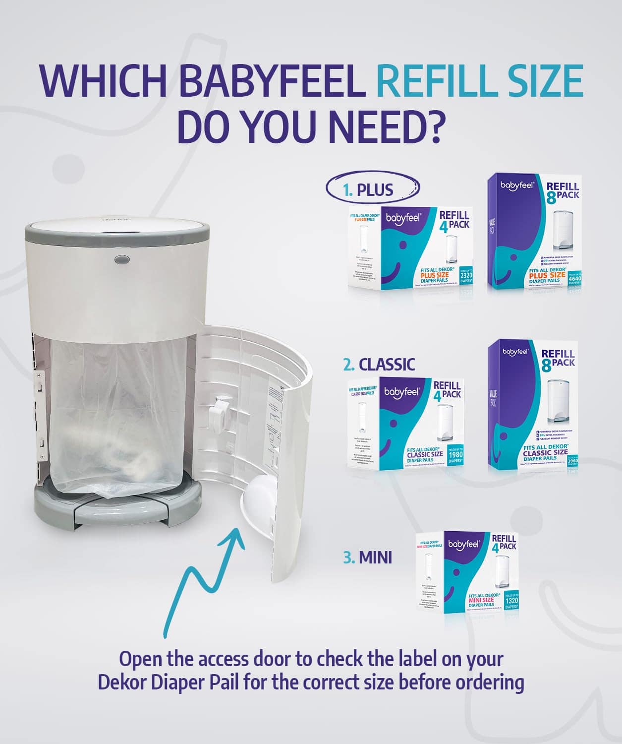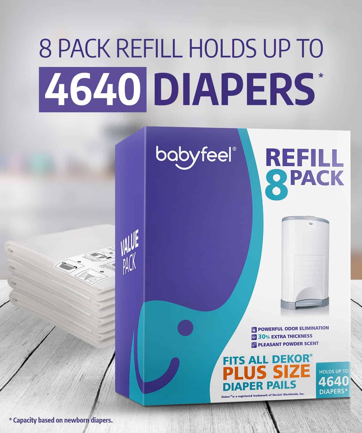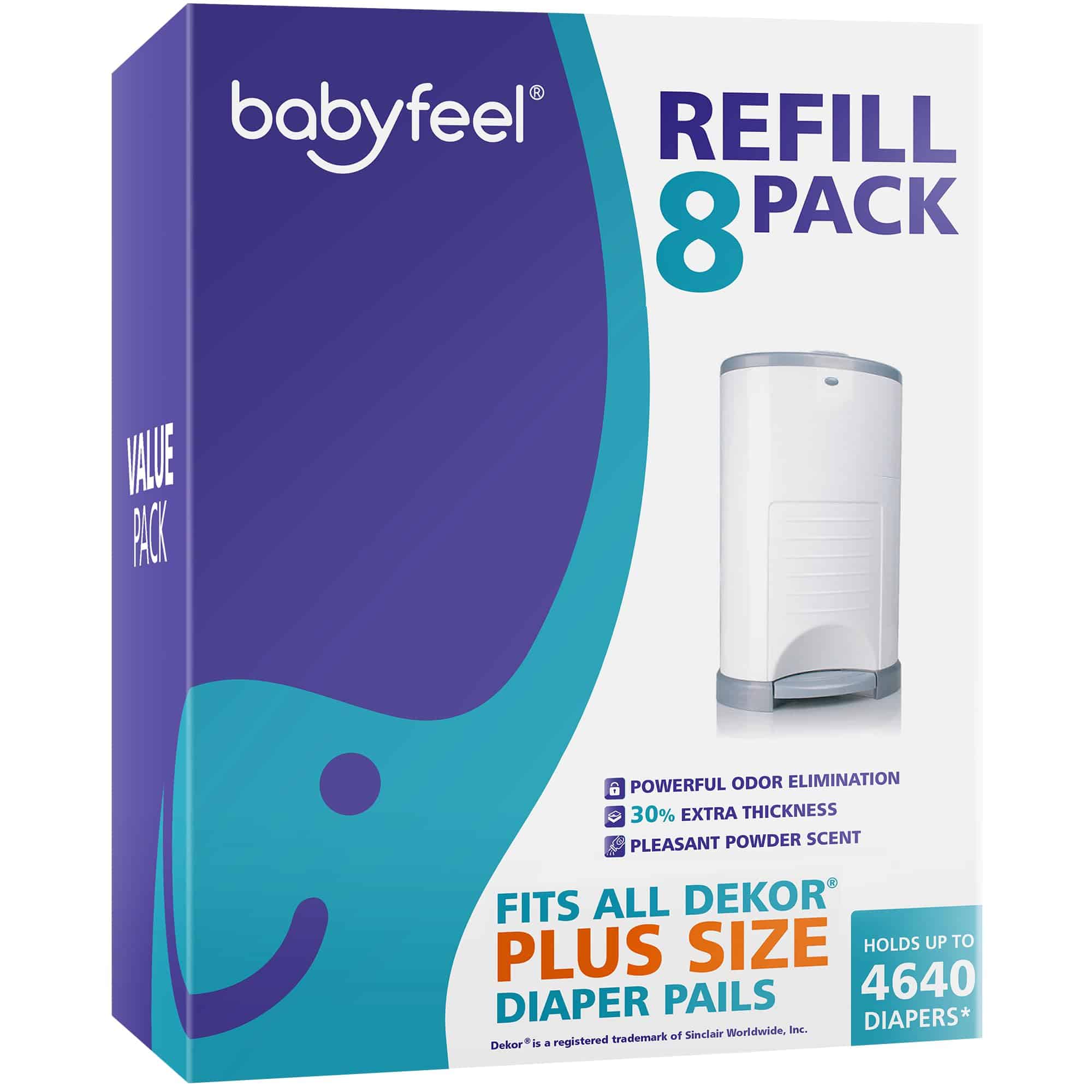 Compatible perfectamente con todos los contenedores de pañales Dekor Plus. Las recargas de Babyfeel de longitud extendida y super resistente se ajustan perfectamente en su contenedor de pañales Dekor Plus. Los padres y cuidadores luchan constantemente con las bolsas de basura para contenedores de pañales que no cumplen con lo esperado. Con Babyfeel, hay una forma rápida, fácil y mucho más económica de manejar la eliminación de pañales sin complicaciones. Las recargas de Babyfeel mantienen la calidad de marca premium a una fracción del precio. Sabemos que quedarse sin recargas para su contenedor de pañales Dekor es un fastidio, por lo que en lugar del paquete estándar de dos recargas, el nuevo paquete de valor de recargas para el contenedor de pañales Babyfeel viene en un paquete de ocho y puede contener hasta 4640 pañales. Sabemos cuán malolientes pueden ser los viveros y es por eso que las recargas de Babyfeel fueron diseñadas para ofrecer la máxima protección contra olores. Gracias a la innovadora tecnología de eliminación de olores de Babyfeel, cada bolsa está hecha de una película de varias capas que proporciona control de olores y durabilidad. Sin fragancia porque en Babyfeel creemos que su vivero siempre debe estar libre de químicos o alérgenos, hemos mantenido nuestras recargas sin fragancia, mientras le proporcionamos una eliminación de olores potente que asegura que su vivero siempre será un deleite para estar en cualquier momento. Garantía de felicidad, estamos orgullosos de cada producto de Babyfeel y realmente nos preocupamos por usted y su bebé. Si no está completamente satisfecho con su Recarga Dekor Plus de Babyfeel, no dude en devolverla para obtener un reembolso completo o un reemplazo. Por qué Babyfeel, somos padres al igual que usted, por lo que conocemos de primera mano las preocupaciones y gastos que conlleva la crianza de un bebé, es exactamente por eso que hemos creado Babyfeel. Nos esforzamos por diseñar los mejores productos al mejor precio siempre teniendo en cuenta el interés de su bebé.