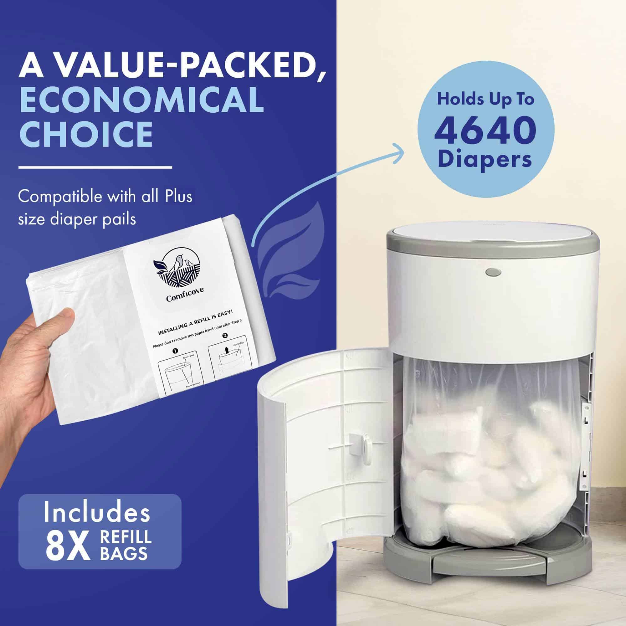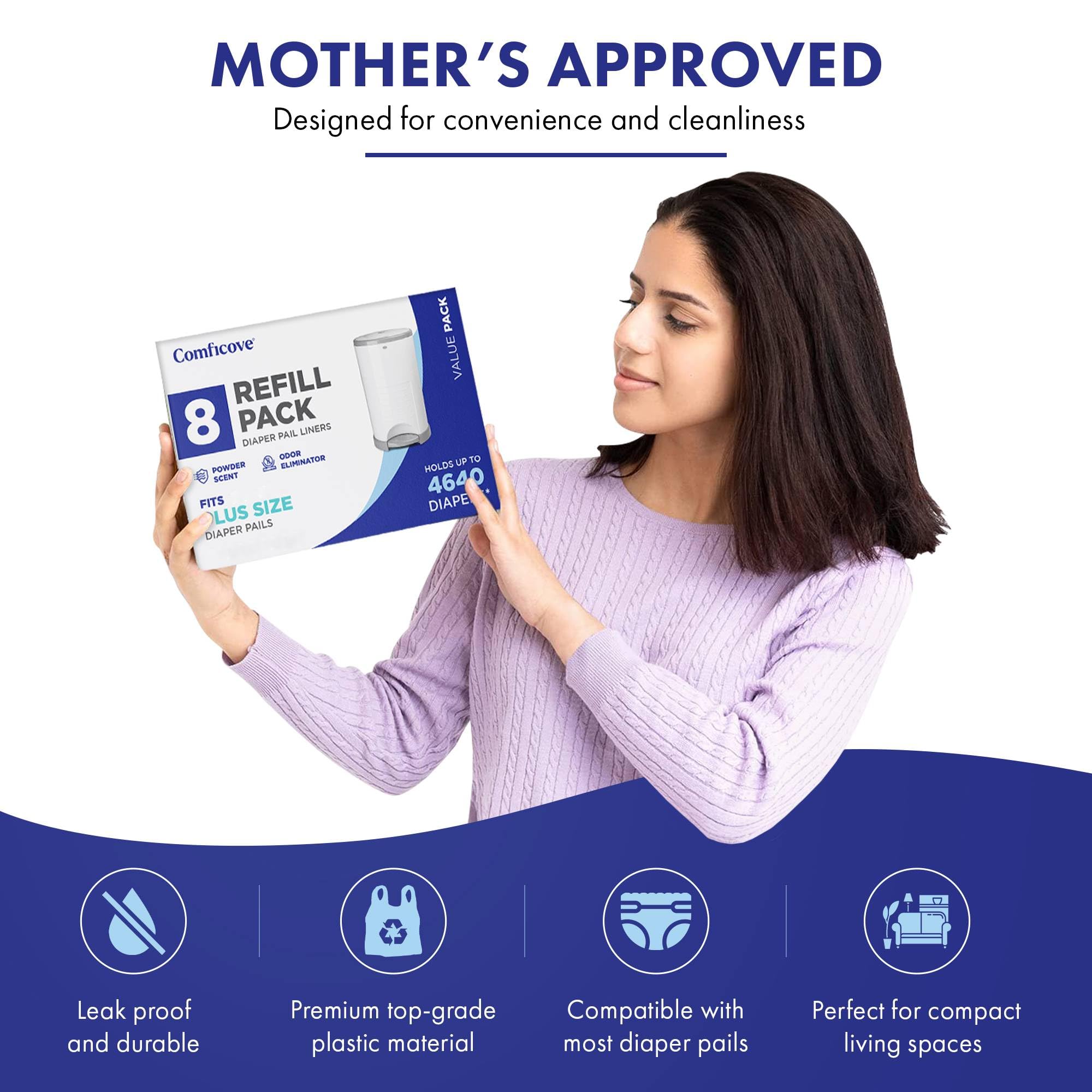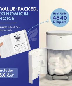 Recargas Comficove compatibles con DEKOR PLUS Pañaleras | Paquete de 8 | Bolsas de recambio para pañaleras extra gruesas | Fragancia fresca | Fácil de reemplazar y desechar bolsa de pañales | Disposición de pañales para bebés sin olor. Ajuste clásico y EKO Classic sin manos para pañaleras: Las recargas están hechas especialmente para adaptarse a todas las pañaleras de tamaño clásico de Diaper Dekor (las pañaleras de tamaño plus no cabrán). Set de valor: Este set incluye cuatro bolsas de recambio que se ajustan a la mayoría de las pañaleras del mercado. Reducirá los olores y hará la vida de los padres más fácil. Es una excelente manera de mantener tu casa ordenada y limpia. Hecho para durar: El set de bolsas de pañales desechables tiene la ventaja de un diseño duradero debido a que está hecho de material plástico premium que mantendrá los aromas a raya y evitará filtraciones. Las recargas de pañales para pañaleras son ideales para hogares modestos o apartamentos, y sin duda facilitarán tu trabajo como padre. Ecológico: Nuestras bolsas desechables para pañales son ideales para aquellos que se preocupan por el medio ambiente, que es una de sus mejores…[truncated]