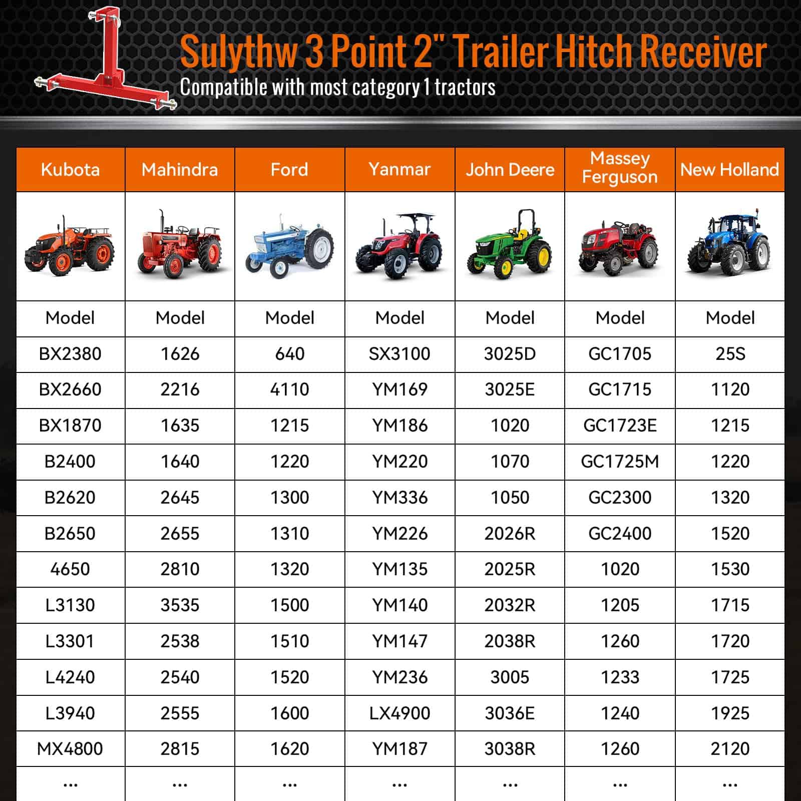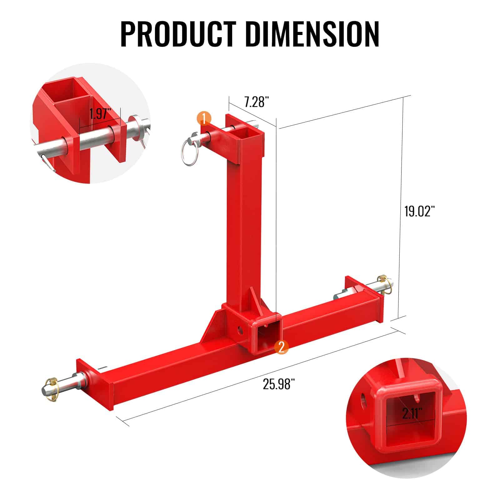 Se adapta a tractores de Categoría 1: El tamaño del receptor de enganche de 3 puntos es de 25.98 pulgadas de ancho x 19.02 pulgadas de alto y se adapta a todos los tractores de Categoría 1. El diámetro de los dos pasadores inferiores es de 0.83″. Por favor, elija el tamaño correcto para su máquina.