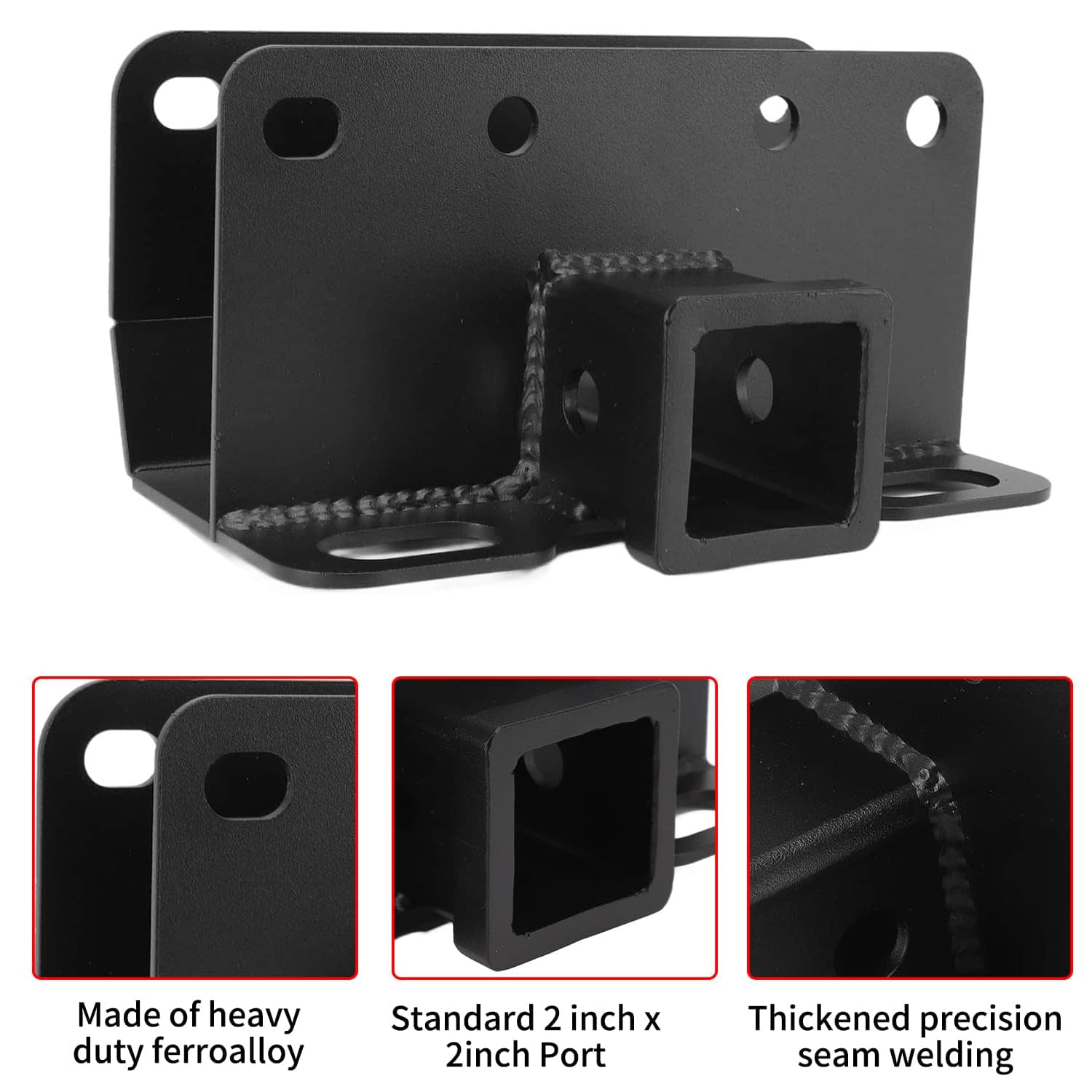 Construido con acero de alta resistencia premium, este receptor ofrece una resistencia superior y una durabilidad duradera. Está clasificado para un peso bruto del remolque de 3500 lb y un peso de la lengüeta de 350 lb, lo que lo hace perfecto para una variedad de necesidades de remolque. Además, ha sido tratado con un recubrimiento especial de polvo negro que lo hace extremadamente anticorrosivo y capaz de soportar diversas condiciones difíciles.