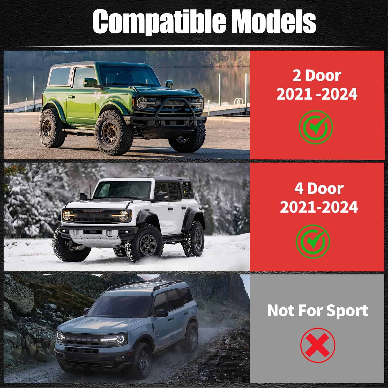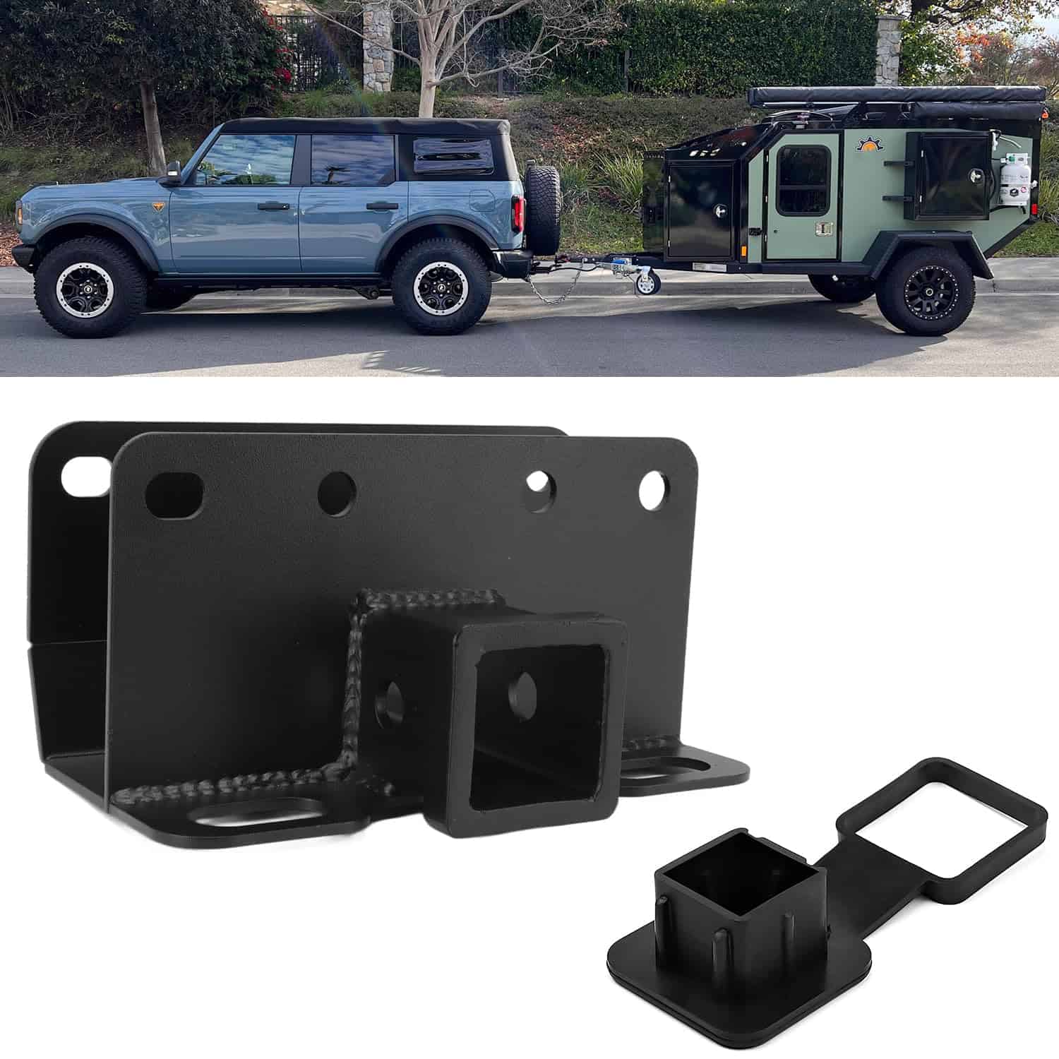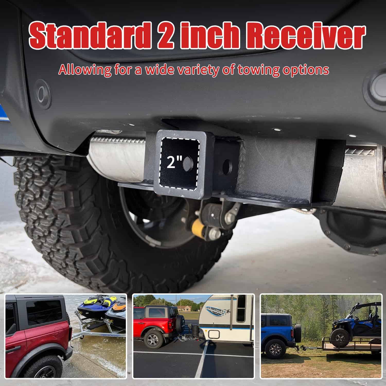 Receptor de enganche de remolque de 2″ compatible con accesorios Ford Bronco 2021-2025 2/4 puertas Clase 3 Receptor de enganche de remolque trasero (Estándar). Este receptor de enganche está diseñado específicamente para adaptarse a Ford Bronco de 2 puertas y 4 puertas de los años 2021-2025. Se instala atornillando directamente a los agujeros de fábrica, sin necesidad de perforación ni corte. No es apto para Bronco Sport.
