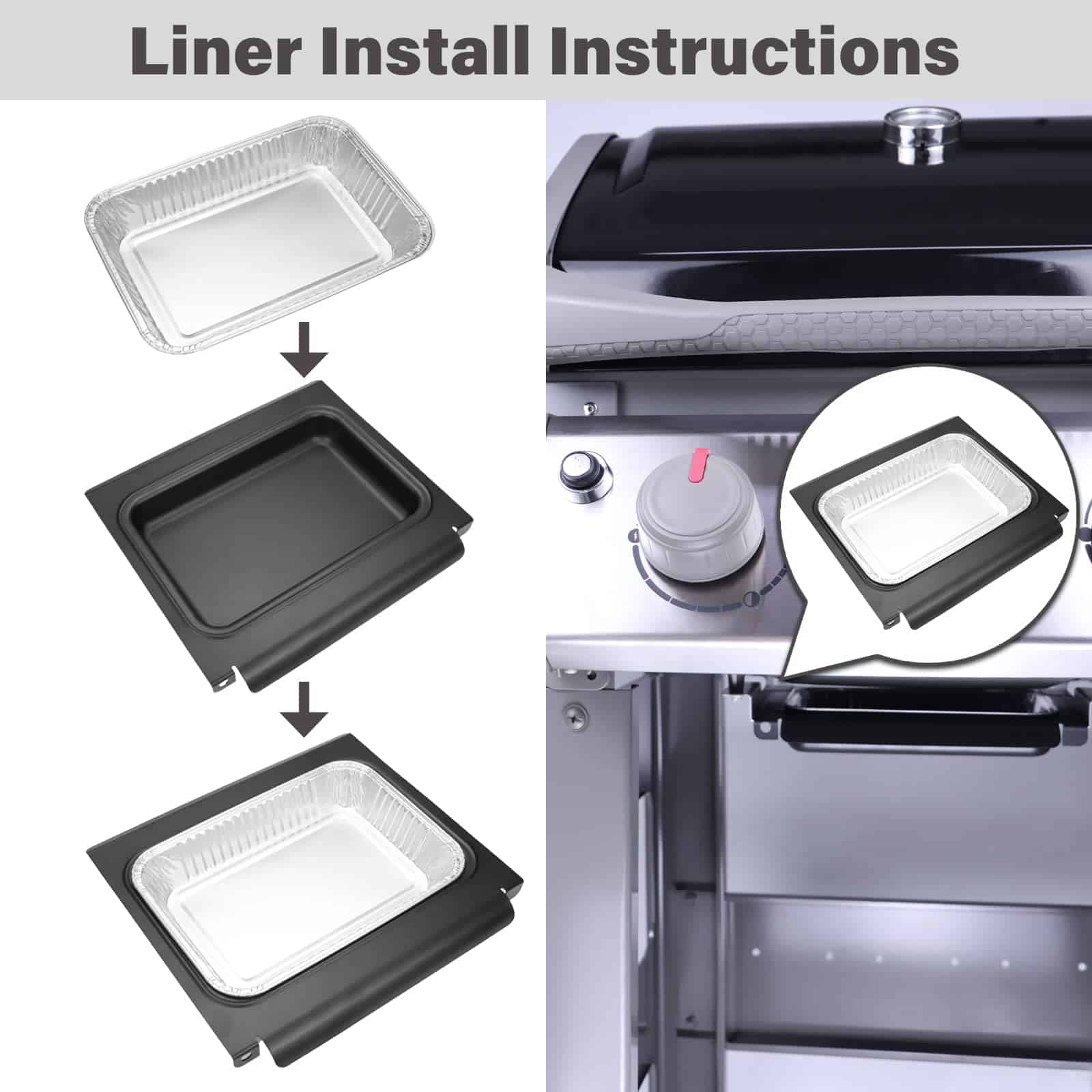 El recogedor de grasa está hecho de acero de alta calidad con un revestimiento resistente al agua, al aceite y a altas temperaturas que está diseñado para durar. Los revestimientos de aluminio son desechables y reciclables, además de usarse como revestimientos de bandeja de grasa de Weber, también se pueden utilizar para cocinar, almacenar alimentos, preparar comidas, etc.