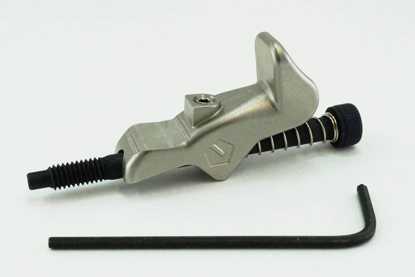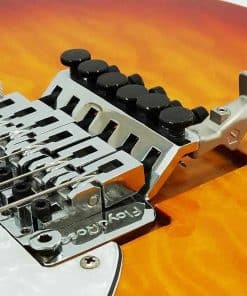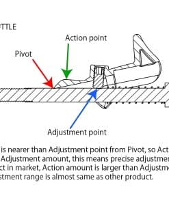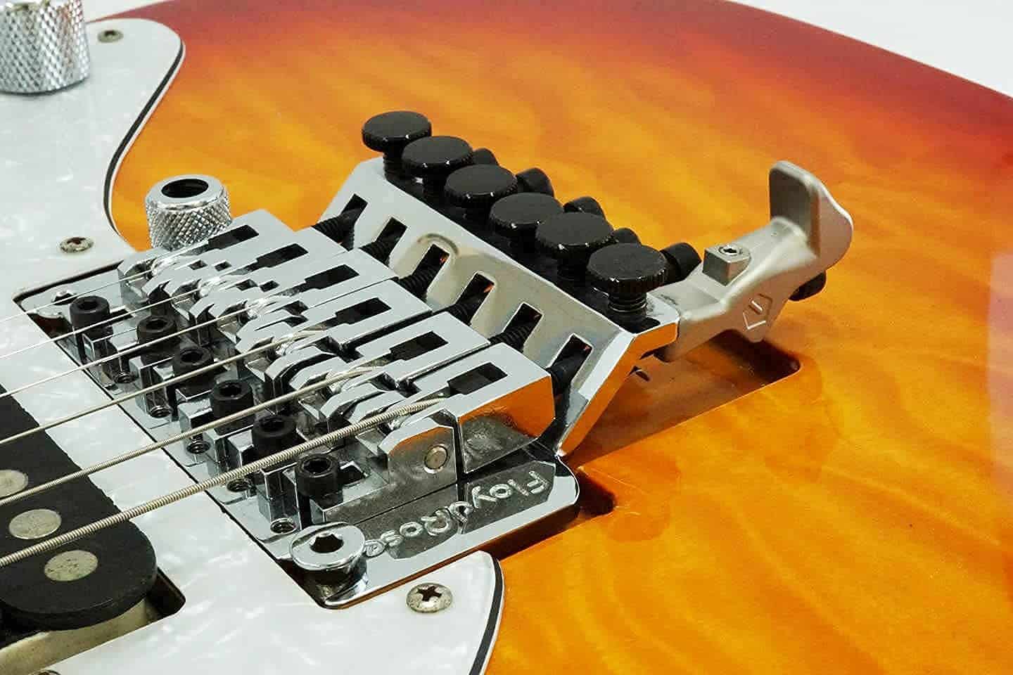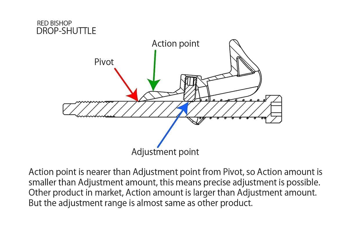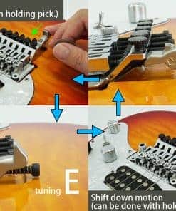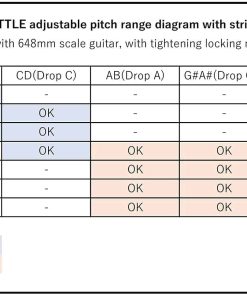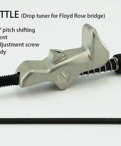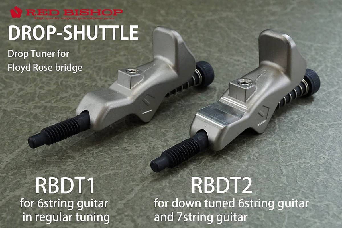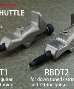DROP-SHUTTLE (RBDT1) es nuestro nuevo afinador de pitch para puentes tipo Floyd Rose. (Este artículo no se puede usar en puentes Ibanez EDGE y GOTOH 1996T). Este producto está diseñado para un cambio de pitch fácil y preciso. Escuchamos que los afinadores de pitch para Floyd Rose en el mercado necesitan ser agarrados con los dedos, y a veces es difícil cambiar el pitch. Por lo tanto, diseñamos un afinador de pitch fácil y preciso, llamado DROP-SHUTTLE. También creamos un afinador de pitch para guitarras afinadas hacia abajo como las de 7 cuerdas y guitarras de 6 cuerdas afinadas hacia abajo (RBDT2). DROP-SHUTTLE tiene una aleta de diseño patentado, puedes cambiar el pitch hacia arriba y hacia abajo con un solo dedo fácilmente. Además, la estructura de ajuste de pitch se mejoró, permitiendo ajustes más finos. Se aplica un agente anti-aflojamiento en el tornillo de ajuste, por lo que el tornillo de ajuste no se aflojará con el movimiento de cambio. Por favor, consulta la relación entre la cantidad de cambio de pitch y los tonos de afinación en el dibujo de abajo. (Nota) El movimiento del brazo hacia arriba debería detenerse a tu lado antes de instalar DROP-SHUTTLE. Montaje posible: FLOYD ROSE ORIGINAL y productos OEM de FLOYD ROSE (Floyd Rose 1000, Floyd Rose Special, etc.), Schaller Lockmeister. Montaje imposible: Ibanez Edge, Lo-Pro Edge, GOTOH 1996T, etc.