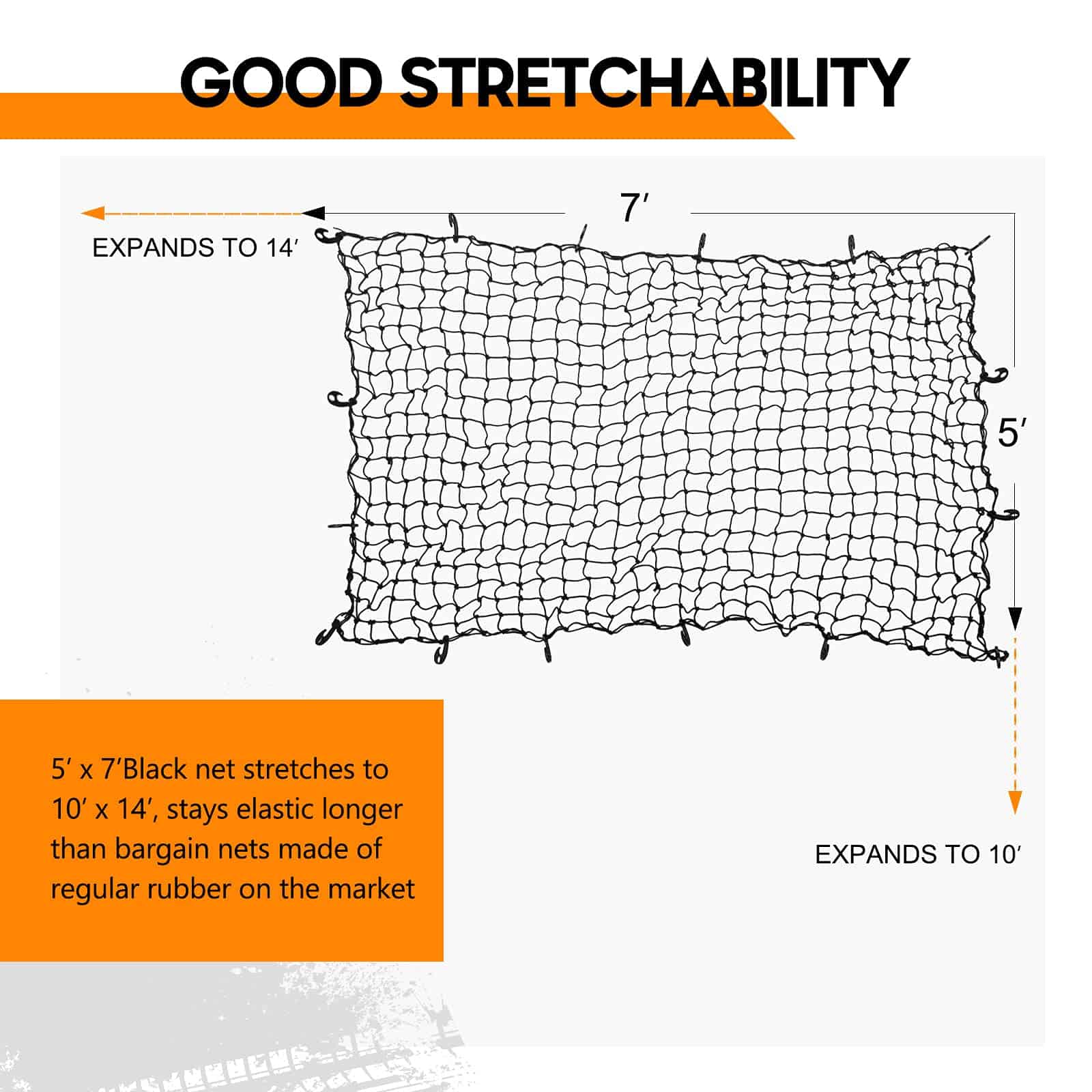 RED DE CARGA DE CUERDA ELÁSTICA RESISTENTE: La red de carga de cuerda elástica resistente de 7′ x 5′ se estira a 14′ x 10′, es ideal para asegurar cajas, bolsas y pertenencias personales en parrillas de techo, camas de camión, remolques, RVs, o donde necesite sujetar una gran cantidad de carga. Hecha de material de látex bungee, esta red se mantendrá elástica por más tiempo que las redes baratas hechas de goma regular en el mercado. CRAFTED WITH 5MM THICK ELASTIC WEBBING: La red está fabricada con una gruesa cinta de bungee de 5 mm para una máxima durabilidad y longevidad. Los 16 ganchos ajustables de plástico ABS con agujeros convenientes permiten estirar o fijar clips de mosquetón fácilmente. BOLSA DE ALMACENAMIENTO INCLUIDA: Cada red de carga viene con una bolsa de almacenamiento para que los usuarios puedan guardar la red fácilmente debajo del asiento, en el maletero o garaje. Mantenga su carga segura y evite que se caiga con nuestra red de carga de cuerda elástica resistente.