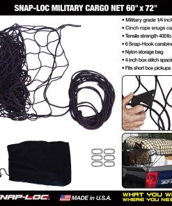 ¡Esta red de carga militar hecha en USA con cuerda de amarre mantiene convenientemente la carga y la basura en camiones y remolques! La red de carga está hecha de nylon resistente de grado militar de 1/4″ de grosor con cuadrículas de 4 pulgadas de ancho. Incluye cuerda de amarre con cierre de bloqueo, 6 mosquetones con gancho para el ajuste y bolsa de almacenamiento. La red tiene una capacidad de 400 libras que se puede aumentar agregando más mosquetones con gancho. Snap-Loc también ofrece una variedad de Accesorios para el Sistema, SNAPLOCS E-Track Singles y Correas para casi cualquier tipo de aplicación. ¡Snap-Loc es el control de carga definitivo!
