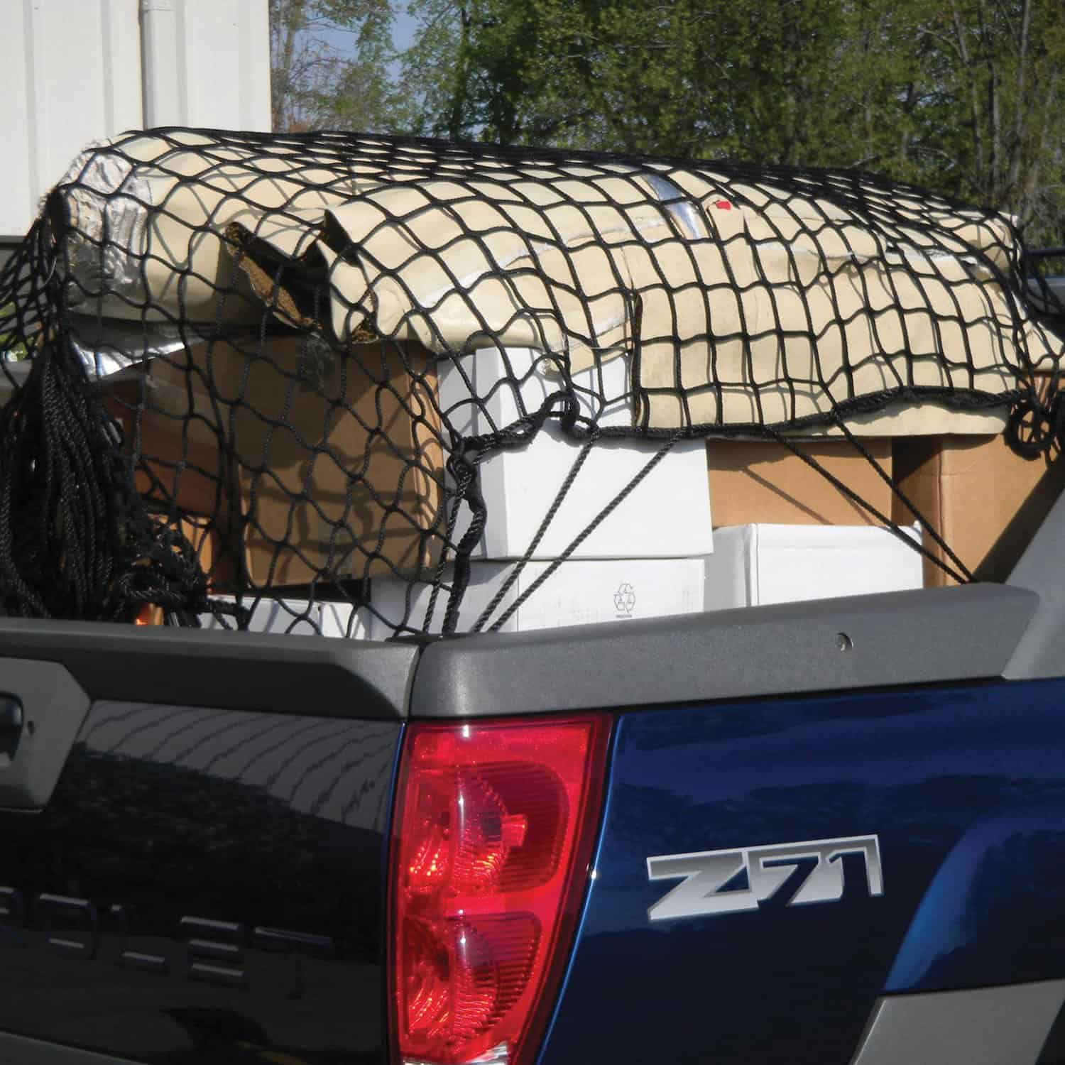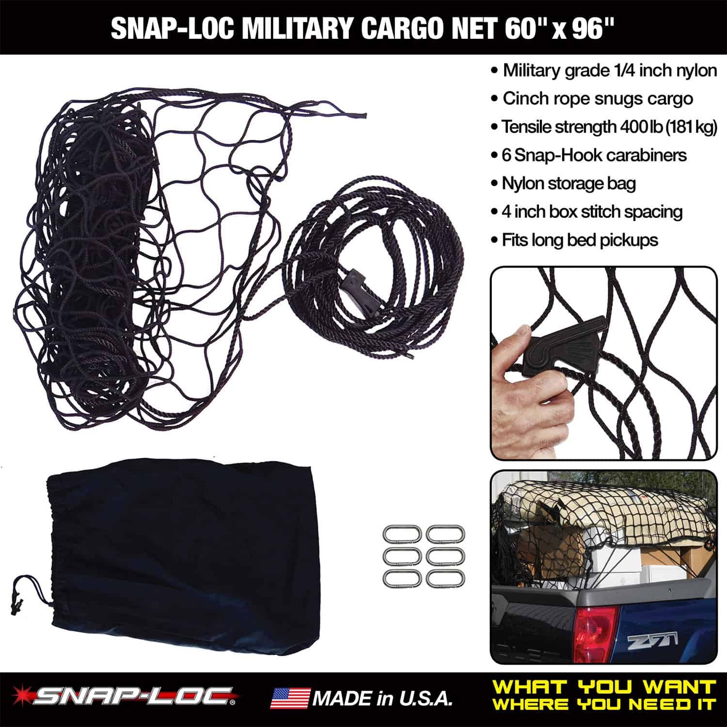 ¡Esta red de carga de grado militar fabricada en EE. UU. con cuerda de sujeción sujeta de manera conveniente la carga y los objetos en camiones y remolques! La red de carga está fabricada con malla de nylon pesado de grado militar de 1/4 de pulgada de grosor con cuadrados de 4 pulgadas de ancho. Incluye cuerda de sujeción con cierre de palanca, 6 mosquetones de seguridad para fijación y bolsa de almacenamiento. La red tiene una capacidad de 400 lb que puede aumentarse agregando más mosquetones de seguridad. Snap-Loc también ofrece una variedad de Accesorios para el Sistema, SNAPLOCS E-Track Singles y Correas para casi todo tipo de aplicación. ¡Snap-Loc es el Control de Carga Definitivo!