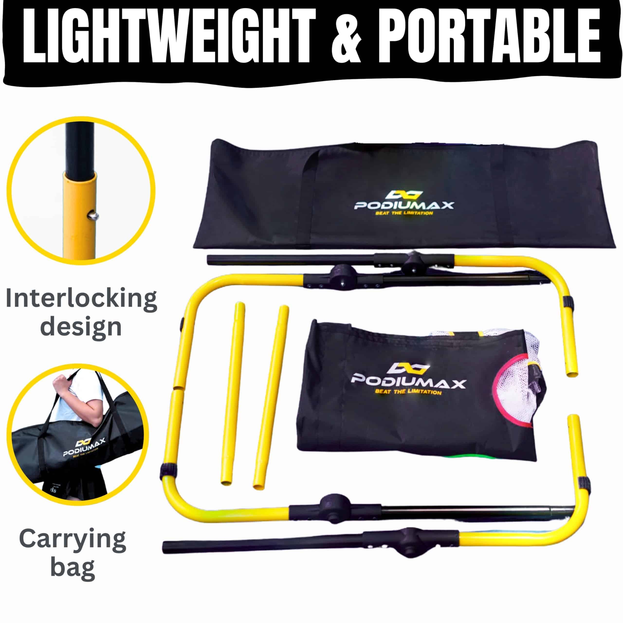 3. LIGERA Y PORTÁTIL – Con un peso de solo 10 libras, la red de objetivos PodiuMax es increíblemente fácil de transportar. Ya sea que vayas al parque, a casa de un amigo o a tu cancha local, esta red se puede configurar en minutos, permitiendo sesiones de práctica espontáneas.