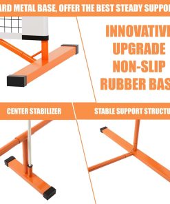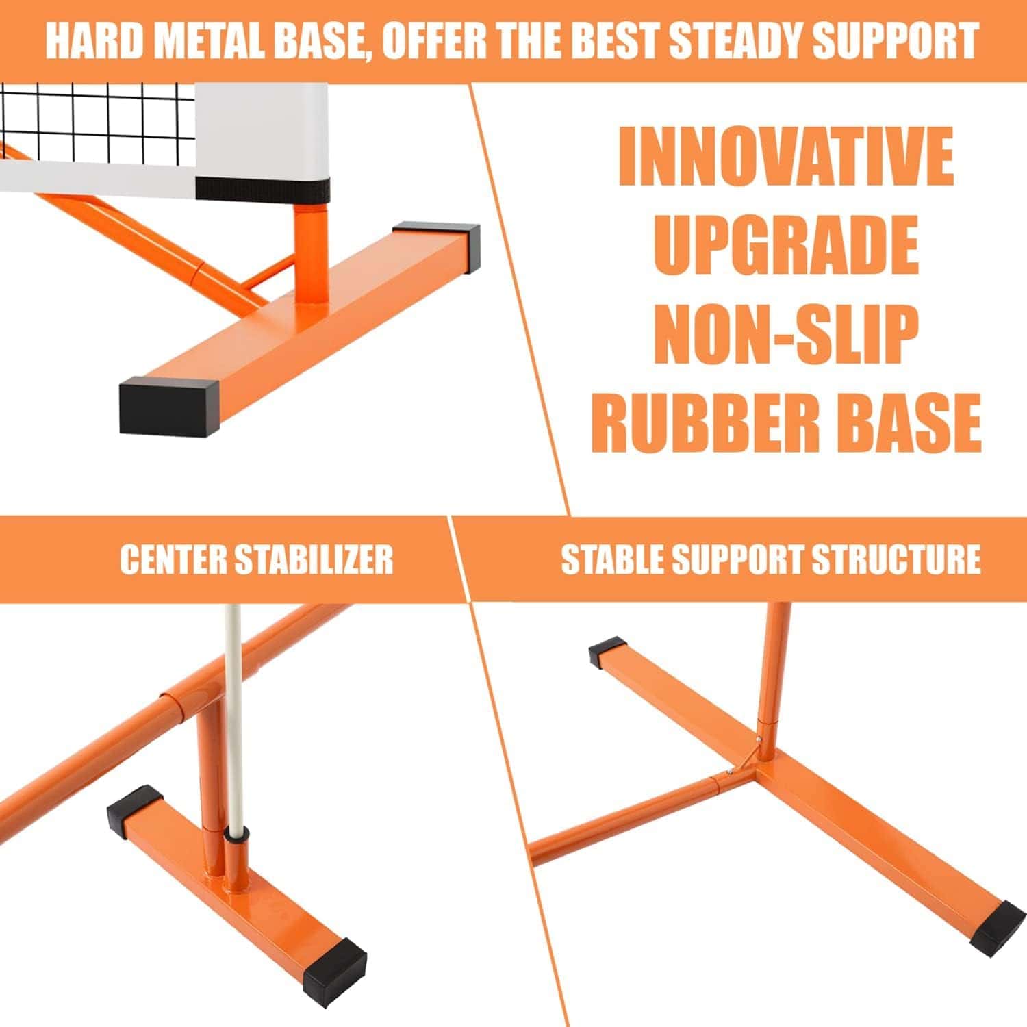 2. Sistema de Red de PickleTech con Base de Goma Antideslizante Mejorada: presenta soportes de arco estructural reforzados en su marco de base y barras de arco. El marco de base está hecho de acero de 16 mm de grosor. Todos los marcos de varilla de conexión utilizan acero de 1.2 mm de grosor, mientras que la mayoría de otros utilizan 0.80mm-1.0mm. La red está hecha de tarpaulina de PVC tejida / red de abrazaderas de 7 capas, que es resistente al agua, al sol y al viento. Ambas redes tienen correas de sujeción para un rendimiento óptimo.