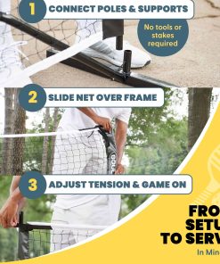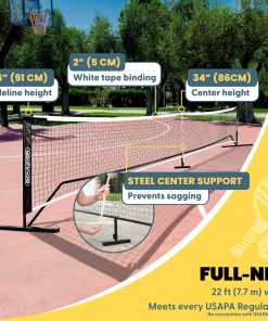 1. Cumple con las regulaciones USAPA: Nuestra red de pickleball de cancha completa está diseñada para cumplir con los estándares USAPA, asegurando un ajuste perfecto para tu cancha de pickleball. Mide 22 pies desde el interior de un poste hasta el interior del otro poste, con una altura del marco lateral de 36 pulgadas y una altura del marco central de 34 pulgadas.