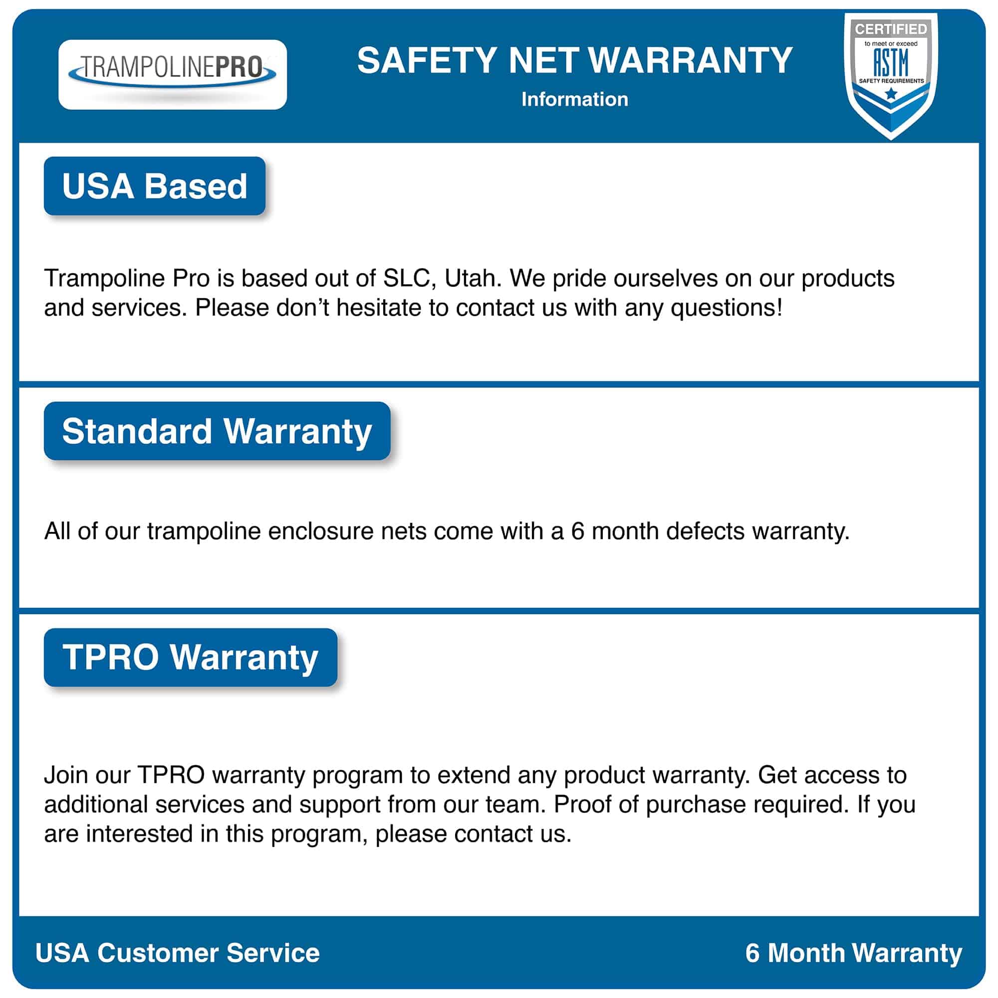 5. SOPORTE AL CLIENTE CONFIABLE: Con sede en Utah, EE. UU., El equipo de servicio al cliente responde a consultas dentro de las 24 horas, brindando asistencia experta con cualquier pregunta sobre la red de trampolín.