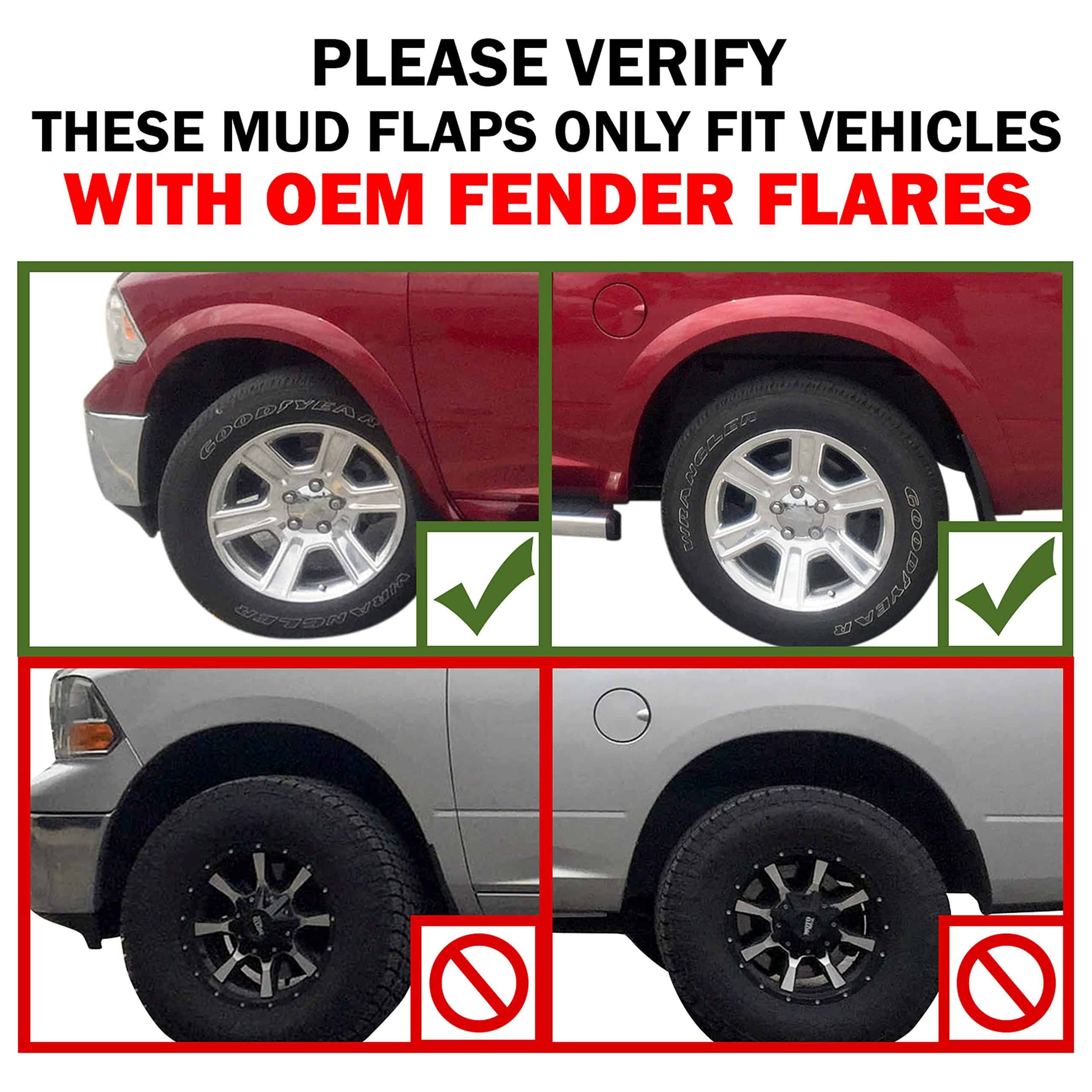 Los protectores contra salpicaduras delanteros y traseros Red Hound Auto Premium a medida están fabricados con termoplástico de grado OEM resistente a todas las inclemencias del tiempo, y pueden resistir las condiciones más duras. Estos protectores robustos, resistentes y de acabado texturizado tienen un diseño elegante que se ve genial y se ajusta perfectamente, proporcionando una cobertura y protección máximas para los neumáticos. La instalación es fácil (instrucciones fáciles de seguir y hardware de montaje incluido). Estos protectores contra salpicaduras están diseñados para durar toda la vida, ya que están cubiertos por la garantía de 1 año de Red Hound Auto. Incluye: juego de 4 piezas delanteras y traseras con hardware. Compatible con: Ram 1500 2009-2018 con Guardabarros OEM como se muestra en las fotos y Ram 2500/3500 2010-2018 con Guardabarros OEM como se muestra en las fotos, sin ruedas traseras dobles.