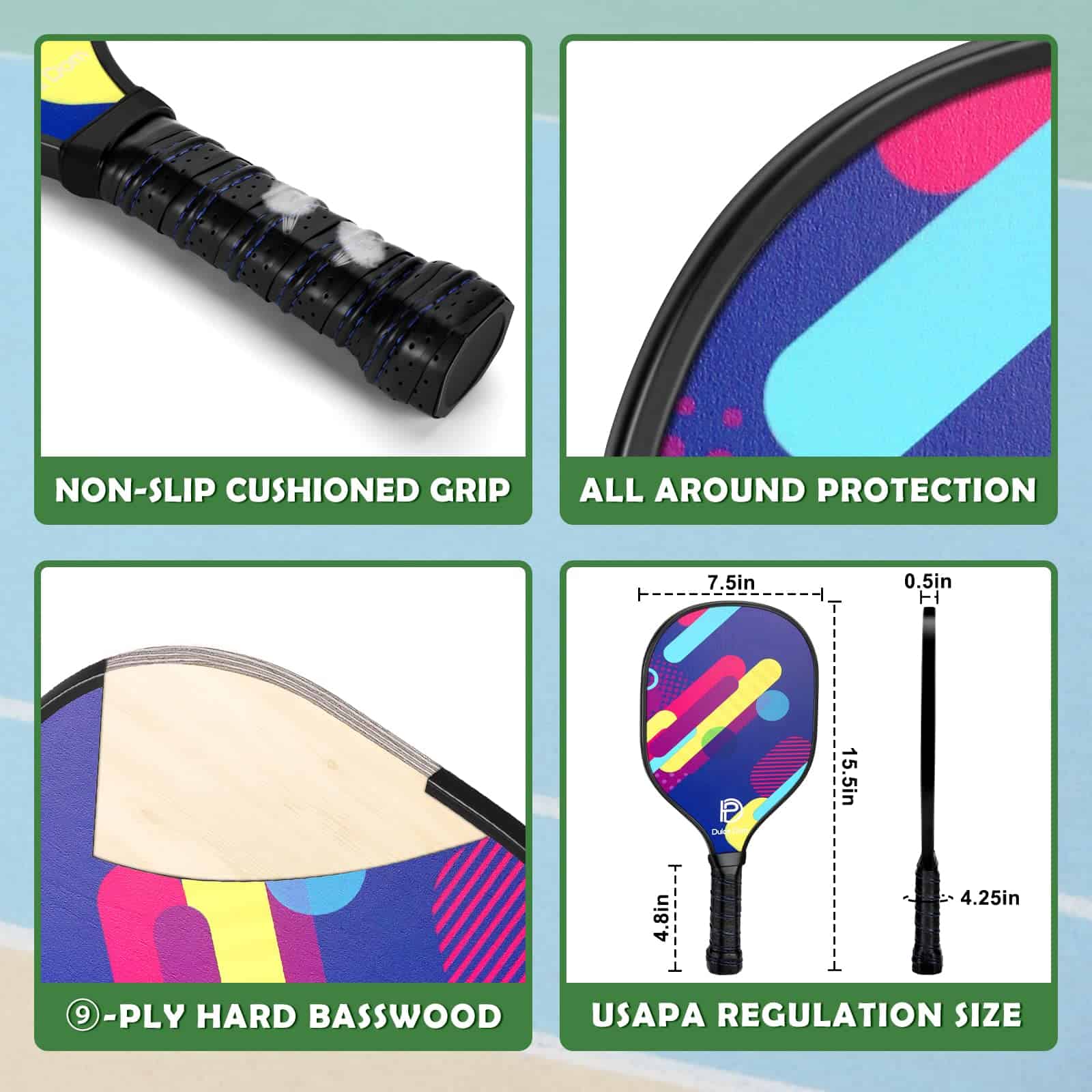 4. Juego completo: El paquete viene con un set de red de pickleball con una bolsa de transporte, un juego de 4 paletas de pickleball con 2 bolas de interior, 2 bolas de exterior, y una bolsa de transporte, por lo que tienes todo lo que necesitas para empezar a jugar de inmediato. Las paletas están hechas de madera resistente y cuentan con un agarre cómodo que es fácil de sostener y controlar.