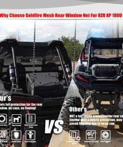 La red trasera de malla Goldfire está construida utilizando una combinación de malla resistente y cinta de polipropileno de 1 pulgada con hilo de nylon para una máxima durabilidad. Utilizan una técnica de construcción de alta calidad para asegurar un tamaño, forma y ajuste consistentes. Con doble costura, resistente a la corrosión y de alta resistencia. El diseño resistente a los rayos UV y la malla permiten una excelente transpirabilidad. Se instalan fácilmente en la barra del chasis sin necesidad de un kit de montaje adicional. Ideales para proteger a los pasajeros traseros, reducir el viento, el polvo y garantizar un ambiente seguro. Compatible con Polaris RZR XP & XP 4 1000 Turbo (Chasis OEM). ¡Incluye juego completo de red trasera para RZR XP 1000!