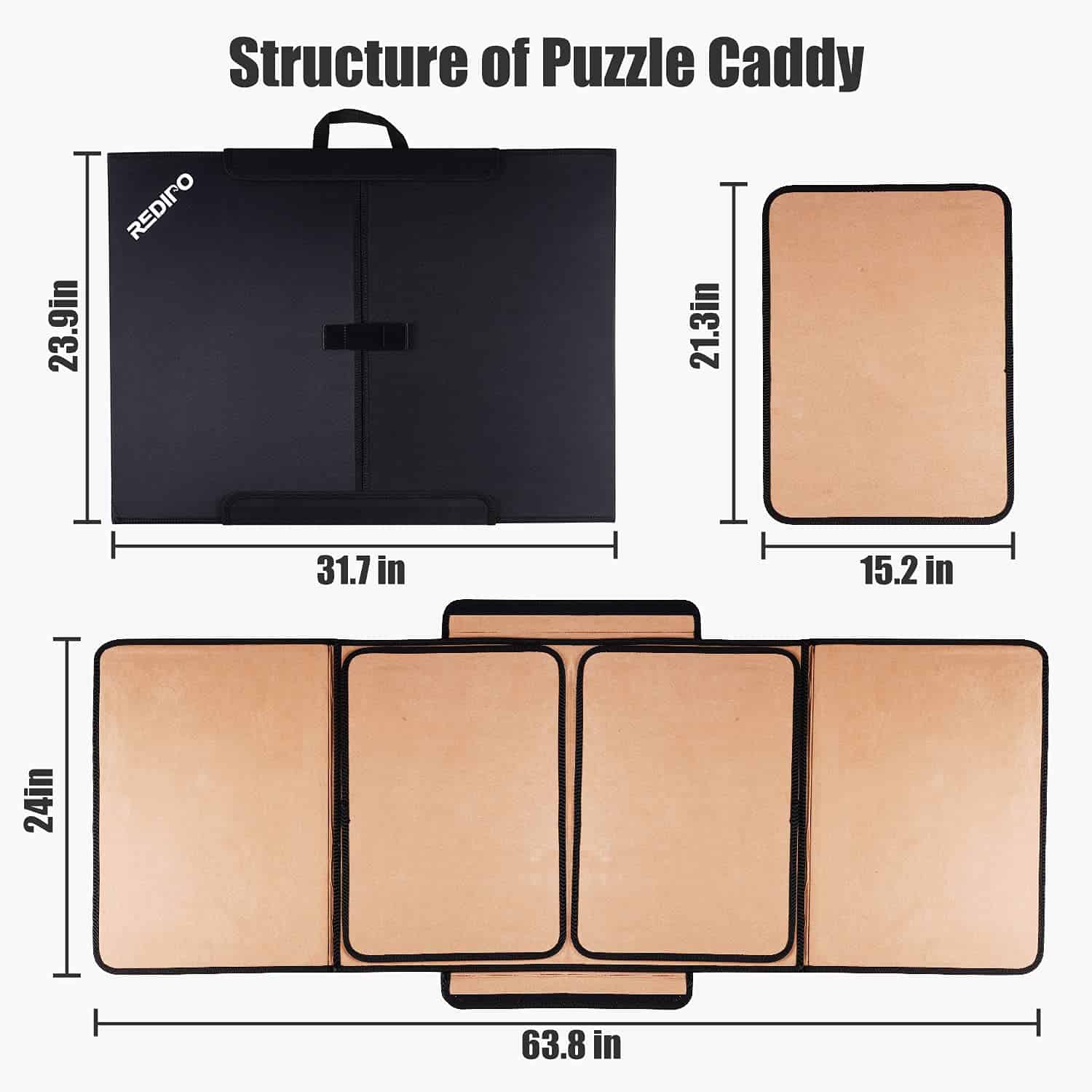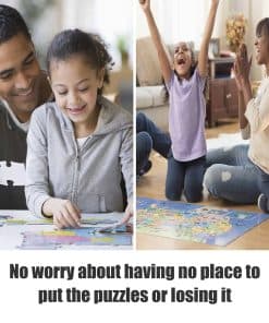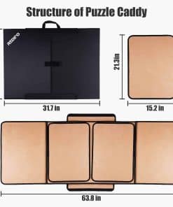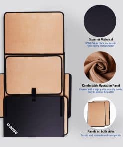 1. MATERIAL DE ALTA CALIDAD – El tablero de rompecabezas está hecho de tela Oxford 600D con cartón marrón en el medio, asegurando una durabilidad duradera. El forro está hecho de gamuza que mantiene tus piezas de rompecabezas en su lugar, fácil de no deslizar. 2. TAMAÑO PERFECTO DE TABLERO DE ROMPECABEZAS – La alfombra de rompecabezas consta de un panel de trabajo central y dos paneles laterales extraíbles. Las dimensiones de trabajo son 63.8 x 24 pulgadas, el tamaño de los paneles laterales extraíbles es de 21.3 x 15.16 pulgadas, el tamaño plegado es de 31.7 x 22.9 x 0.6 pulgadas, peso 8,71 libras. 3. MANTENGA SUS PIEZAS ORGANIZADAS – El tablero de rompecabezas consta de un panel de trabajo central y dos paneles laterales extraíbles. El panel central puede colocar el cuerpo principal del rompecabezas, los dos paneles laterales le permiten clasificar sus piezas por color, tema o borde. La clasificación razonable puede ayudarlo a resolver el rompecabezas. Adecuado para rompecabezas de papel más delgados. 4. PLEGABLE Y PORTÁTIL – Es un diseño perfecto que proporciona un espacio especial para el tiempo precioso en familia. Doble fácilmente este tablero de rompecabezas levantando los lados y fijando el velcro para asegurarse de que las piezas del rompecabezas permanezcan en su lugar. El diseño del asa facilita llevarlo a la casa de un amigo para disfrutar del tiempo del rompecabezas.