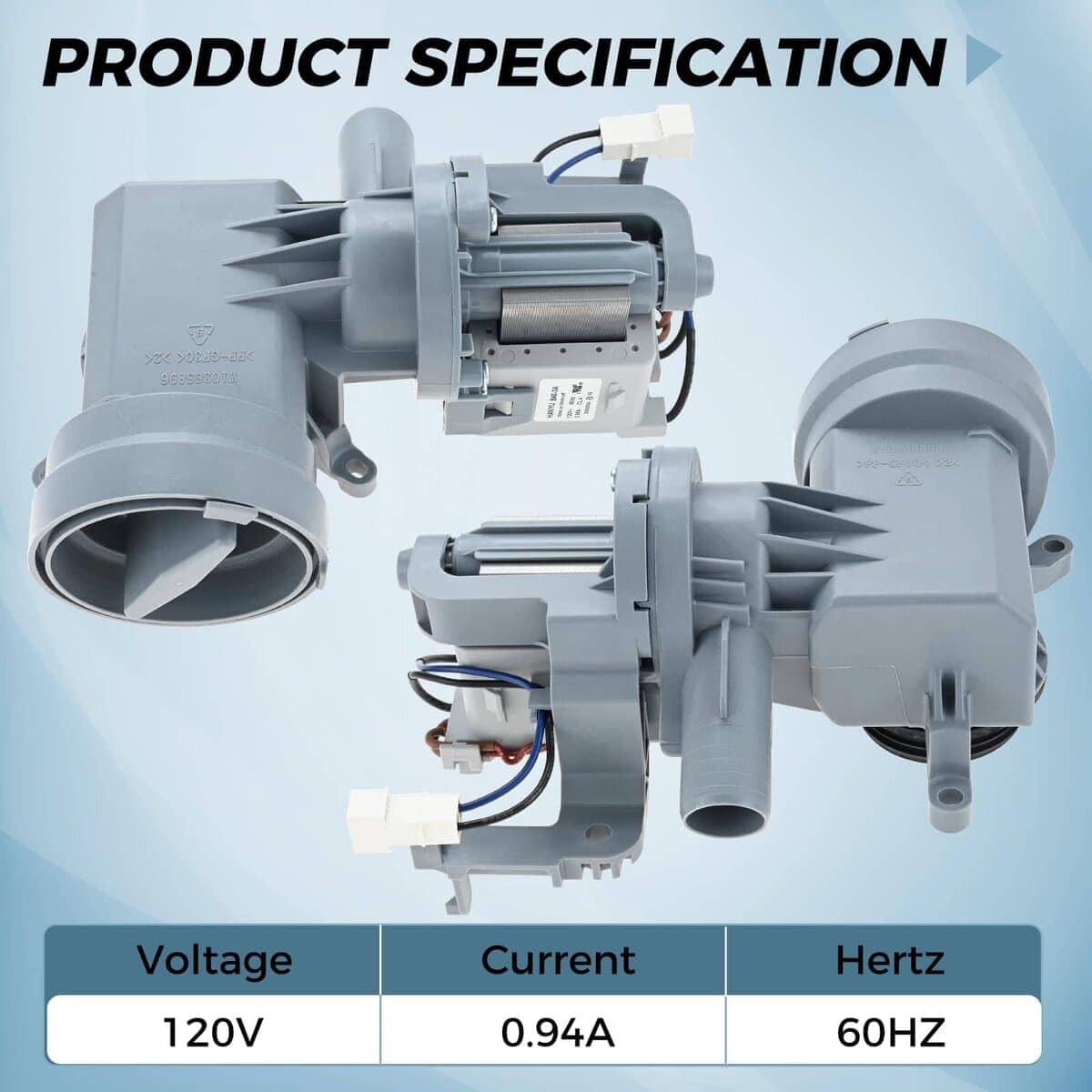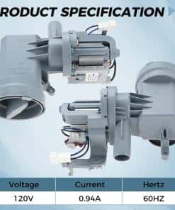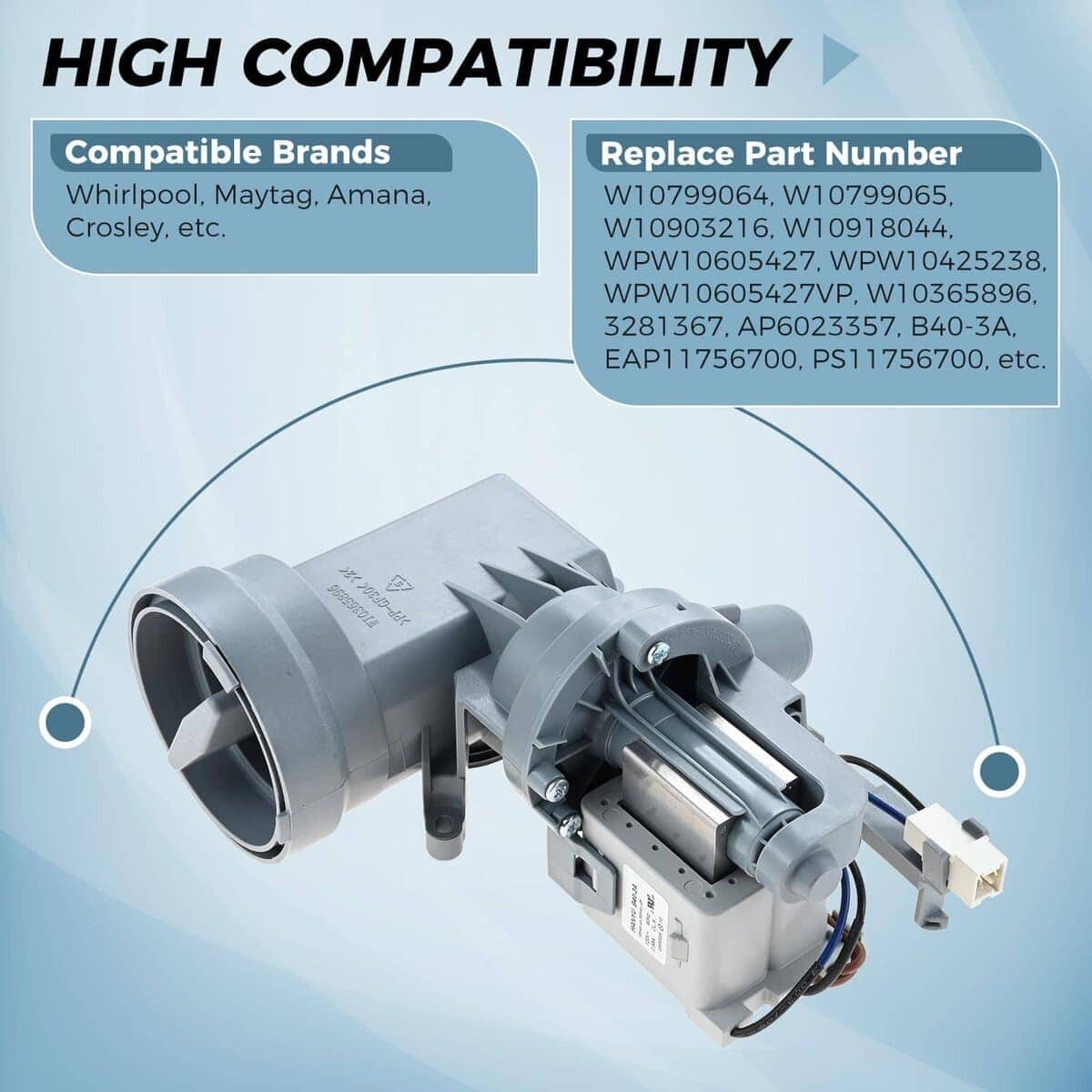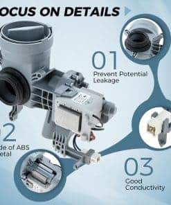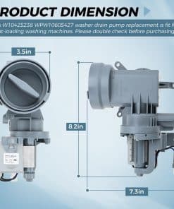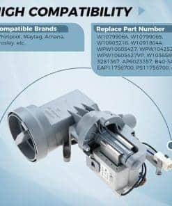 Reemplaza la bomba de drenaje defectuosa de tu lavadora con la nueva y eficiente bomba de drenaje W10425238 W10605427 de MOOTVGOO. Con alta compatibilidad, este producto puede ser instalado en diferentes marcas como Whirlpool, Maytag, Amana, Crosley y más. Fabricada con materiales de calidad, incluyendo ABS y metal, garantiza resistencia al impacto y a la corrosión, y ha sido sometida a pruebas por el fabricante para cumplir con los estándares OEM. La junta de sellado incluida previene cualquier tipo de fuga durante su operación. Esta bomba de drenaje es la solución perfecta para problemas como fugas de agua, ruidos inusuales durante el ciclo de lavado o códigos de error mostrados en la pantalla. La instalación es sencilla y rápida, y te ahorrará el coste de contratar a un técnico. El paquete incluye una unidad de bomba de drenaje W10425238 W10605427 (120V, 60HZ, 0.95A, 10 minutos encendido 50 minutos apagado). Para más detalles sobre modelos compatibles, consulta la lista de modelos en la descripción corta. Si tienes alguna pregunta o inquietud sobre el producto, no dudes en contactarnos, ¡nuestro equipo estará encantado de ayudarte!