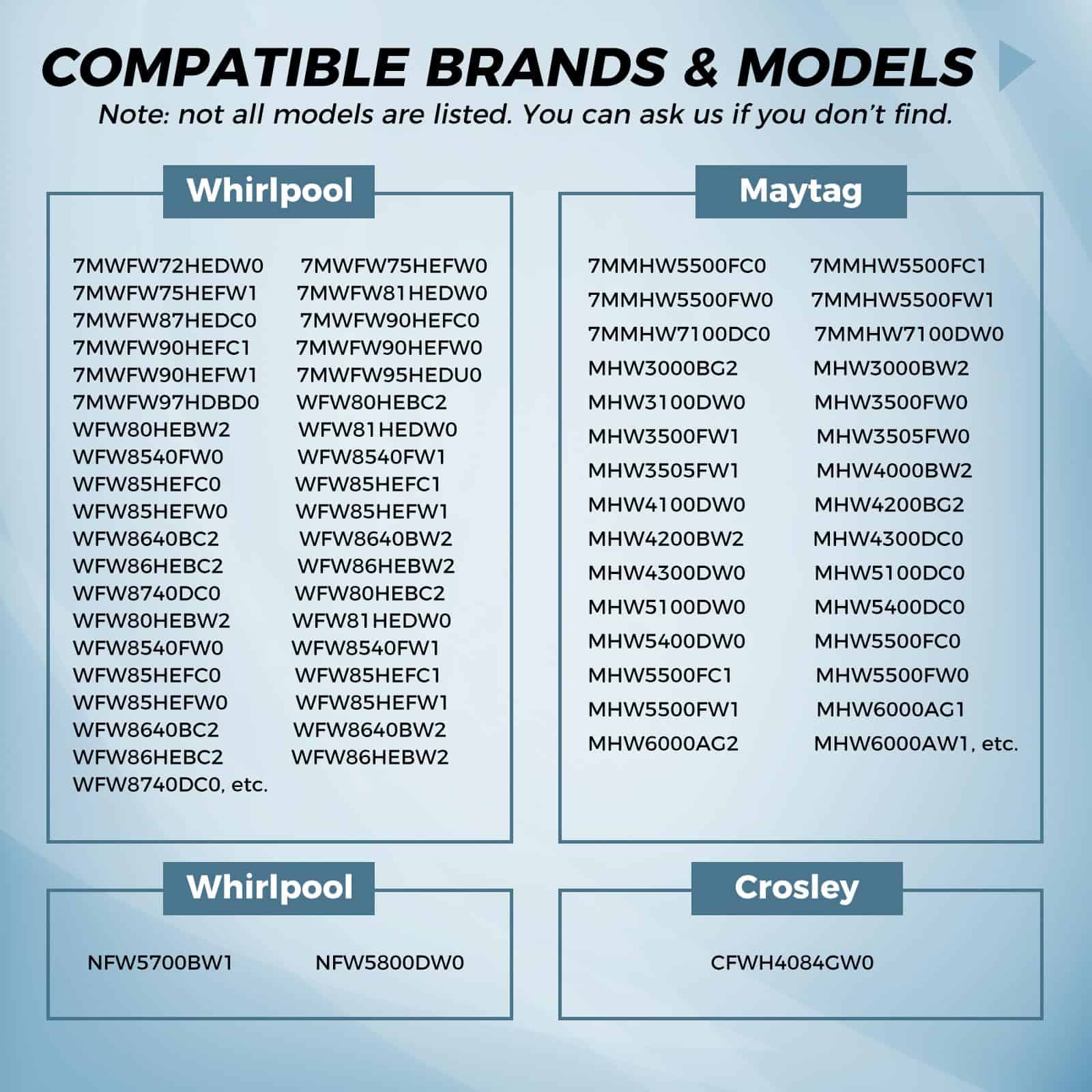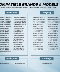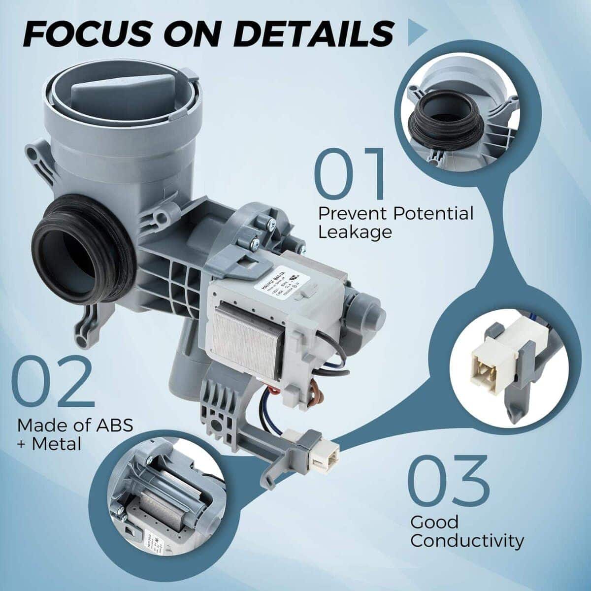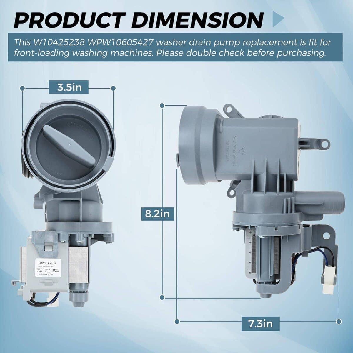 Reemplaza la bomba de drenaje defectuosa de tu lavadora con la nueva y eficiente bomba de drenaje W10425238 W10605427 de MOOTVGOO. Con alta compatibilidad, este producto puede ser instalado en diferentes marcas como Whirlpool, Maytag, Amana, Crosley y más. Fabricada con materiales de calidad, incluyendo ABS y metal, garantiza resistencia al impacto y a la corrosión, y ha sido sometida a pruebas por el fabricante para cumplir con los estándares OEM. La junta de sellado incluida previene cualquier tipo de fuga durante su operación. Esta bomba de drenaje es la solución perfecta para problemas como fugas de agua, ruidos inusuales durante el ciclo de lavado o códigos de error mostrados en la pantalla. La instalación es sencilla y rápida, y te ahorrará el coste de contratar a un técnico. El paquete incluye una unidad de bomba de drenaje W10425238 W10605427 (120V, 60HZ, 0.95A, 10 minutos encendido 50 minutos apagado). Para más detalles sobre modelos compatibles, consulta la lista de modelos en la descripción corta. Si tienes alguna pregunta o inquietud sobre el producto, no dudes en contactarnos, ¡nuestro equipo estará encantado de ayudarte!