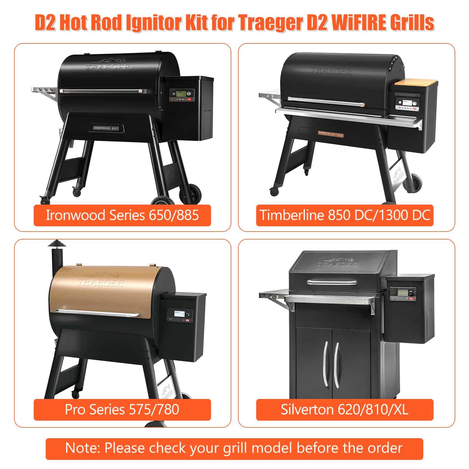 1. Compatibilidad: El encendedor hot rod es compatible con las parrillas Traeger D2 Direct Drive & WiFIRE – Kit de encendedor D2 Hot Rod solo compatible con las parrillas Traeger Pro 575 y 780, Ironwood 650 y 885, Timberline 850 y 1300 (solo Gen 2), Silverton 620 y 810, Century 885.