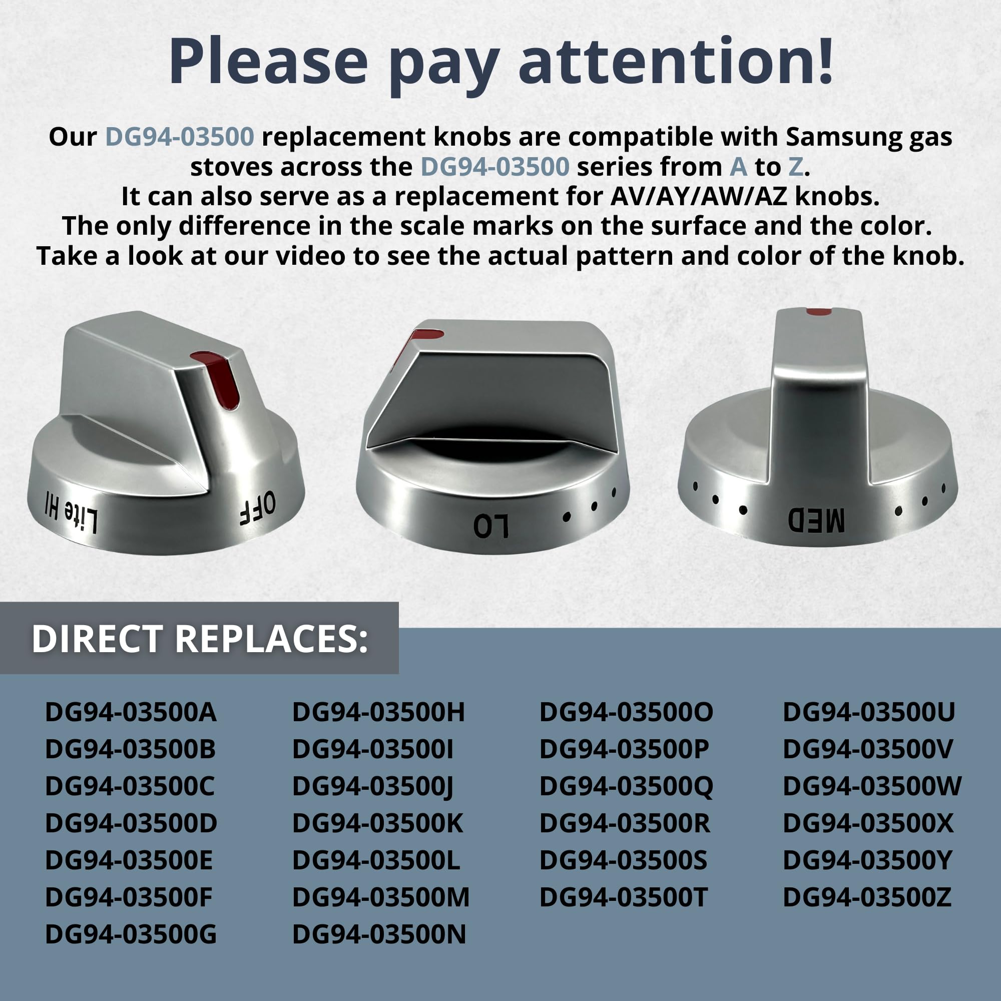 2. Compatibilidad extensa: nuestras perillas de reemplazo DG94-03500A/Z son compatibles con estufas de gas Samsung de la serie DG94-03500, incluyendo varias combinaciones de letras como AA/AU/AV/AW/AX/YD. Aunque los colores y patrones de escala pueden diferir, tenga la seguridad de que pueden ser reemplazados con confianza, asegurando un ajuste perfecto para sus necesidades. Vea nuestro video para ver el patrón y color reales de la perilla.
