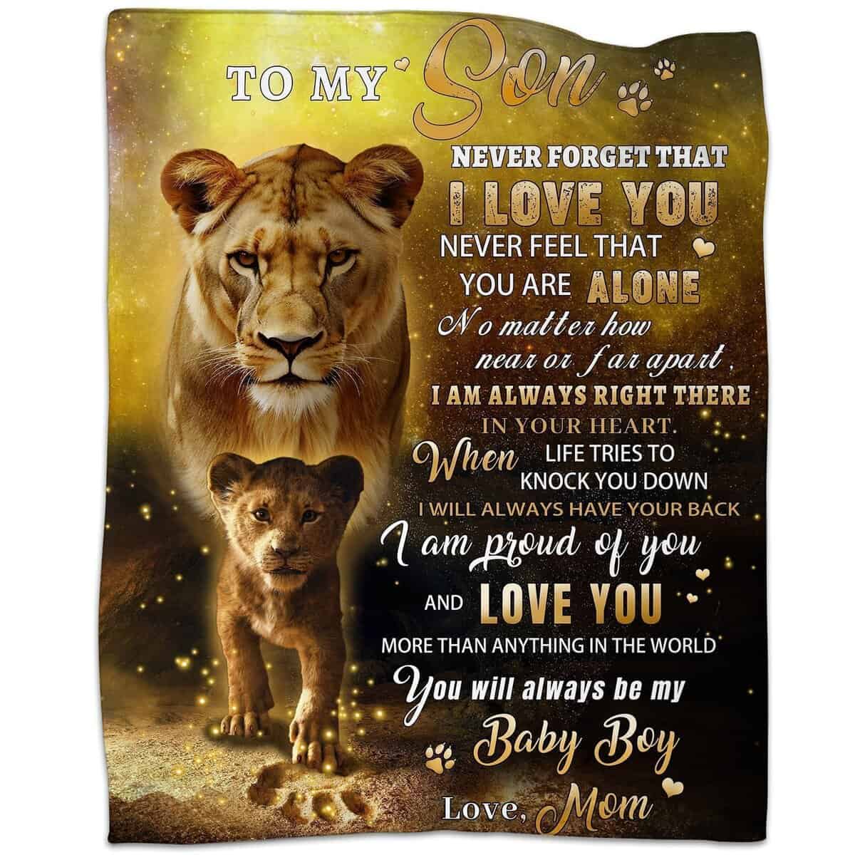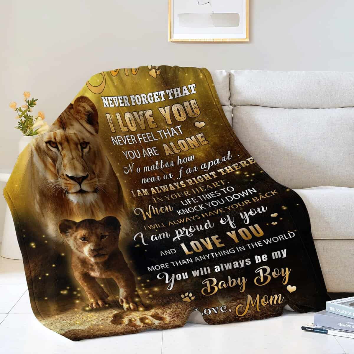 1. Manta con mensaje para mi hijo: Nunca olvides que te amo. Nunca sientas que estás solo. No importa cuán cerca o lejos estemos, siempre estoy ahí en tu corazón. Cuando la vida intenta derribarte, siempre tendré tu espalda. Estoy orgullosa de ti y te amo más que cualquier cosa en el mundo. Siempre serás mi niño. – Mamá.